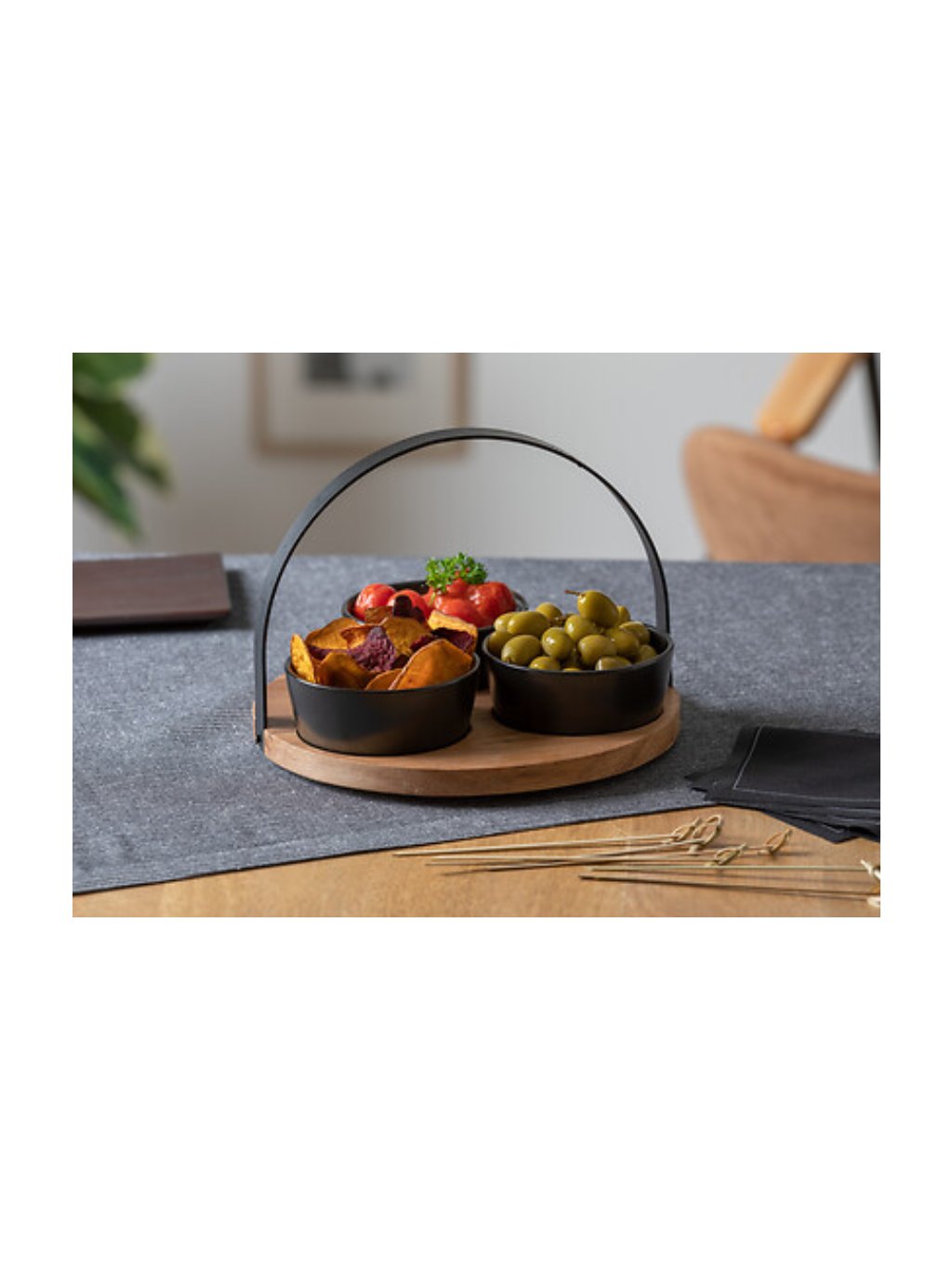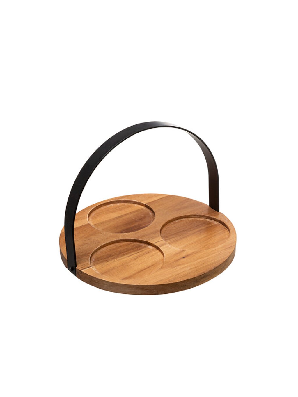 Prírodná elegancia: Kruhový podnos z masívneho akáciového dreva slúži ako stabilná a štýlová základňa pre tri misky.