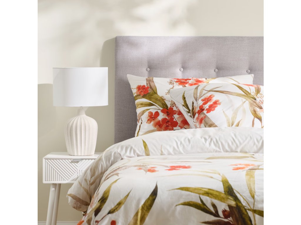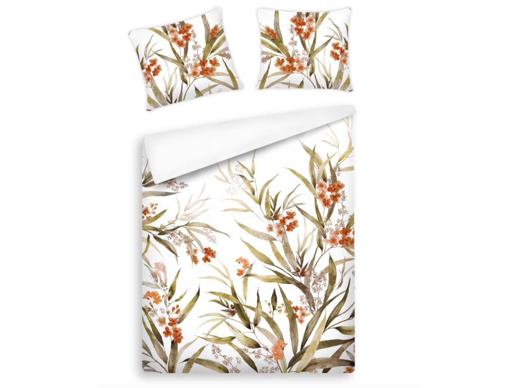 Jemný, akvarelový vzor zelených listov a oranžových kvetov na bielom podklade sa ideálne hodí do prírodných aranžmánov a dodáva ľahkosť moderným a klasickým interiérom. Jednofarebné vyhotovenie zadnej strany vnáša harmóniu a nadčasový motív robí z obliečok výborný návrh na darček a do každej spálne inšpirovanej prírodou.