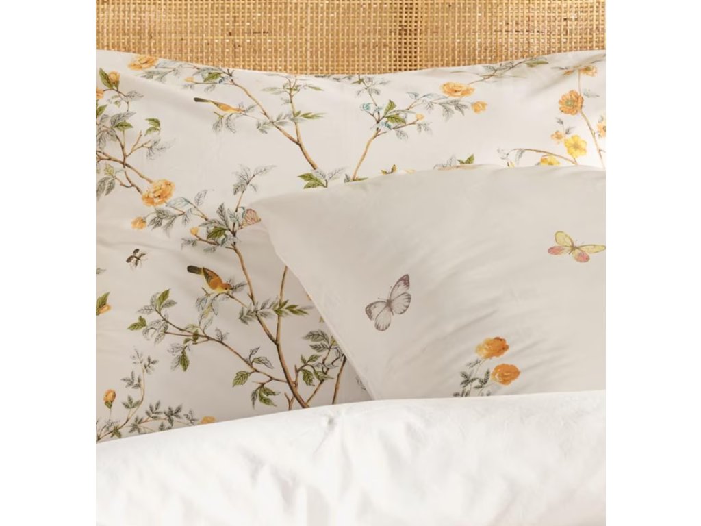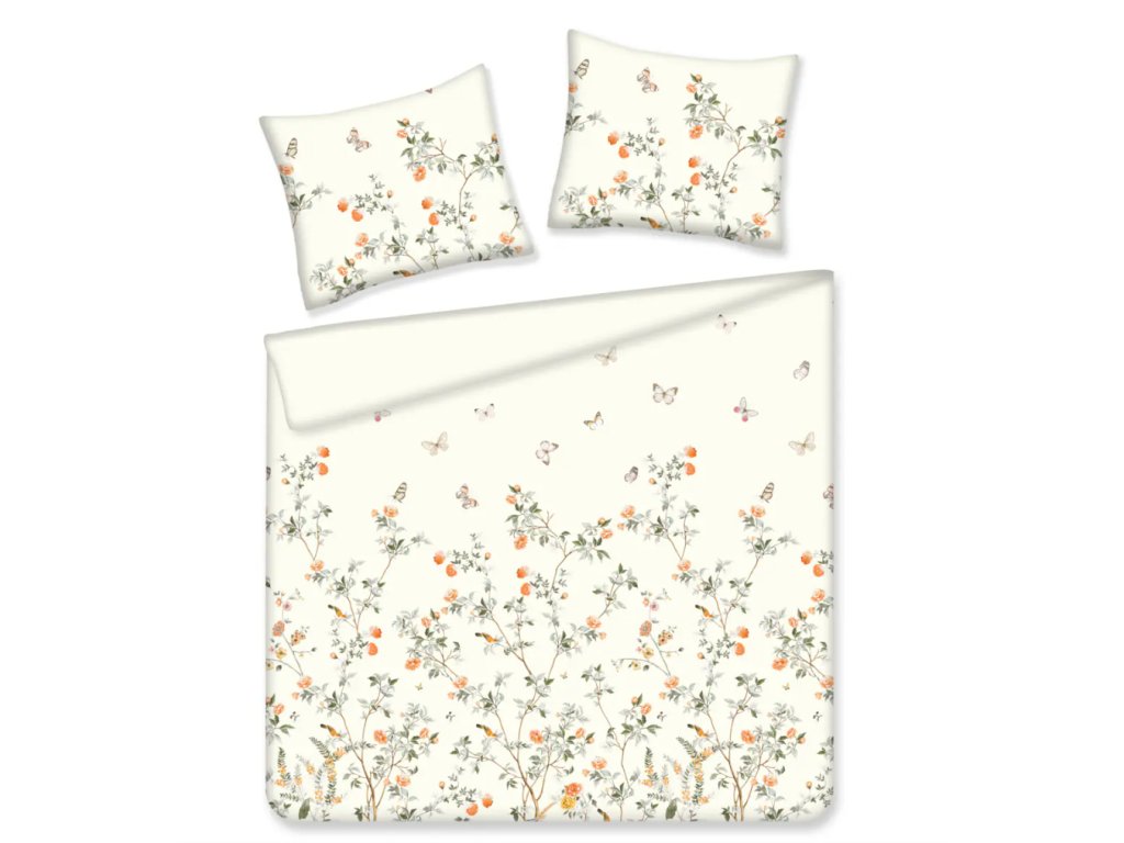 Krémové obliečky Lavro zdobí kvetinový vzor znázorňujúci konáre, oranžové kvety a motýle. Tlmená farebná paleta – ecru, zelená, oranžová a hnedá – zabezpečuje, že obliečky sa hodia do klasických aj moderných spální. Krásny kvetinový motív vnesie do interiéru prírodu a radosť, a jemné spracovanie robí z obliečok tiež ideálny darček.