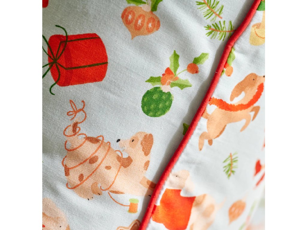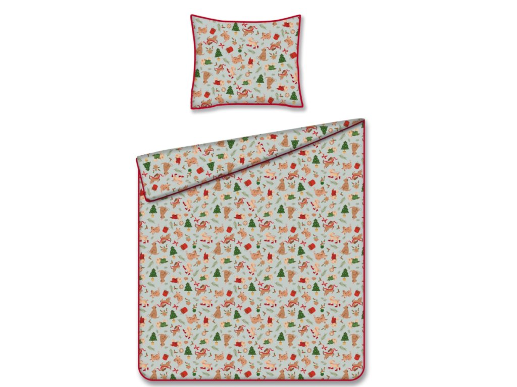 Jemný šalviový odtieň spojený s farebným, vianočným vzorom – darčeky, vianočné stromčeky, zvieratá a červené detaily – vnáša výnimočnú, rodinnú atmosféru do každej spálne. Dekoratívne červené lemovanie precízne podčiarkuje eleganciu vyhotovenia a odlišuje bielizeň od klasických modelov. Kolekcia Dogimas dokonale zapadá do zimných, útulných aranžmánov a celok bude fantastickým tipom na darček pre blízkych.