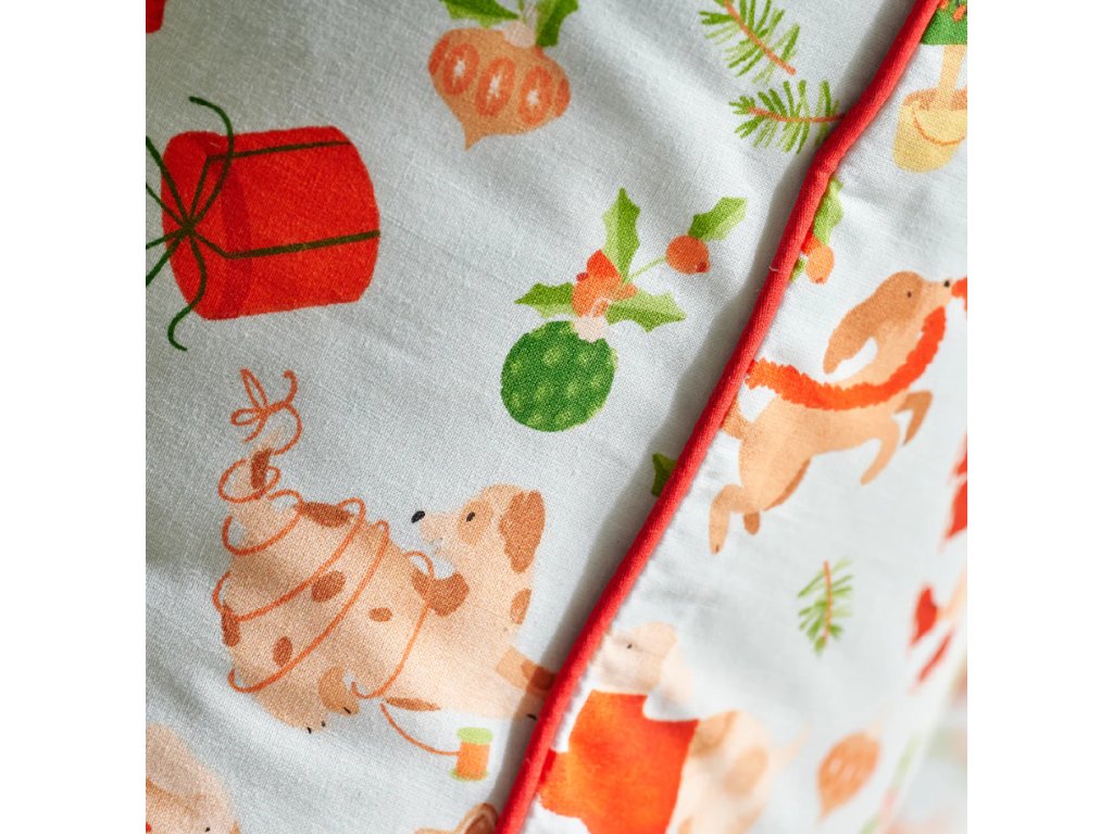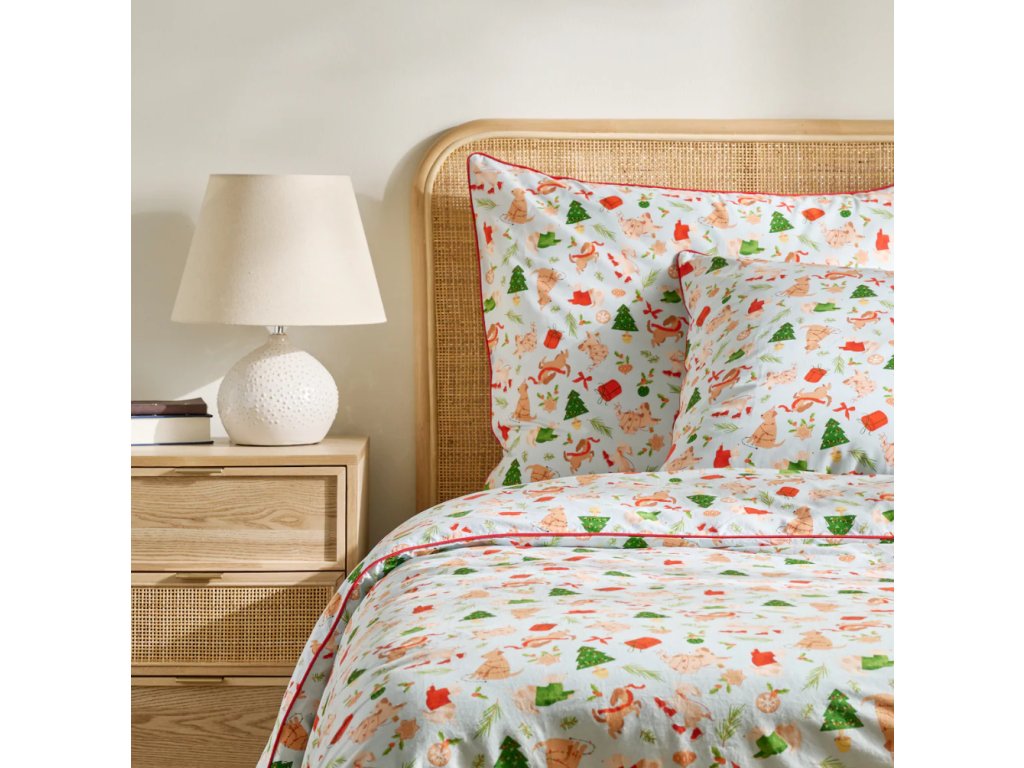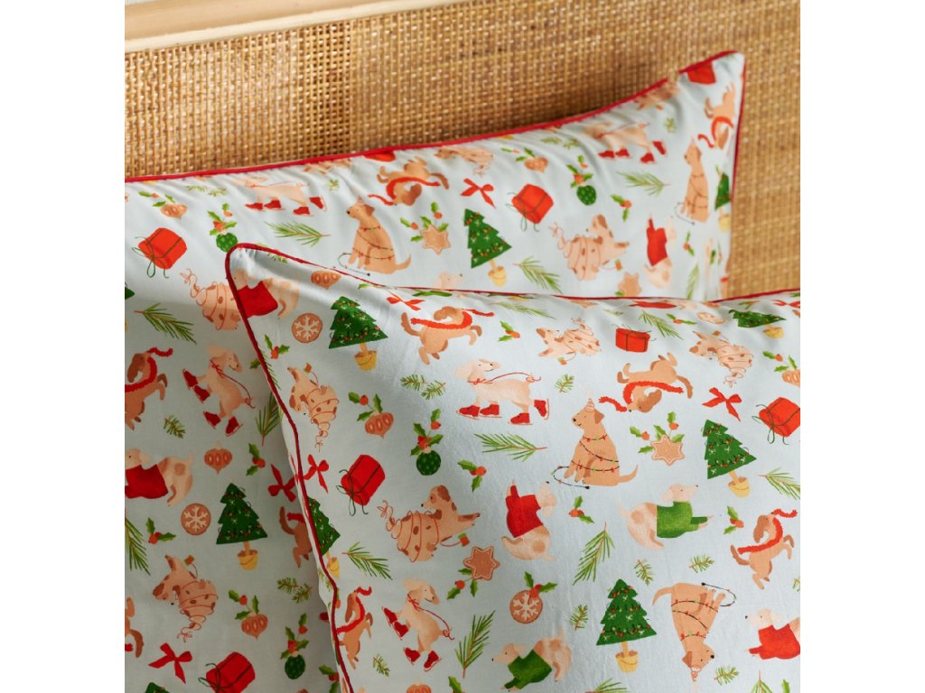 Svetlosalviový odtieň pozadia s farebným, sviatočným vzorom zobrazujúcim psy, vianočné stromčeky, darčeky a dekorácie vnáša do spálne teplú, rodinnú atmosféru a štýlové spestrenie. Červené lemovanie (paspula) decentne podčiarkuje celok a svedčí o výnimočnej starostlivosti o detaily. Posteľná bielizeň Dogimas sa skvele hodí do klasických aj moderných interiérov a výborne poslúži aj ako darček pre milovníkov vianočných aranžmánov.