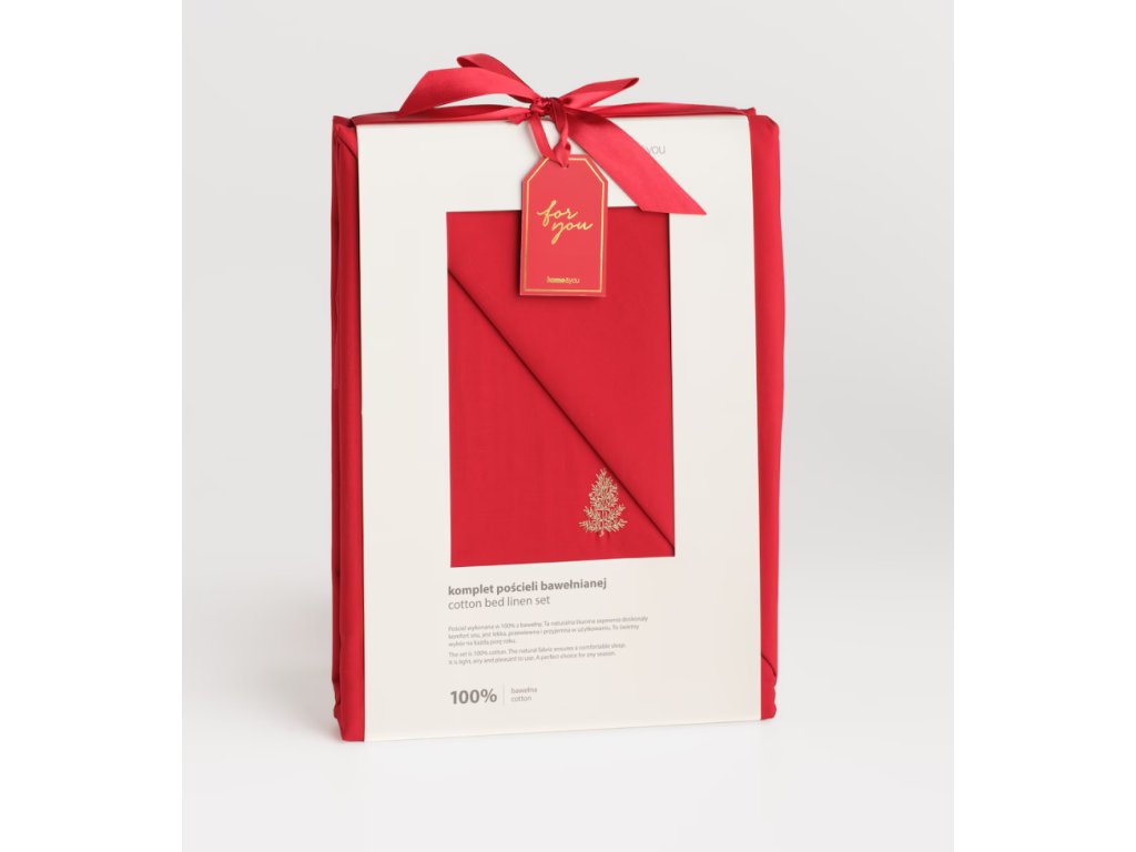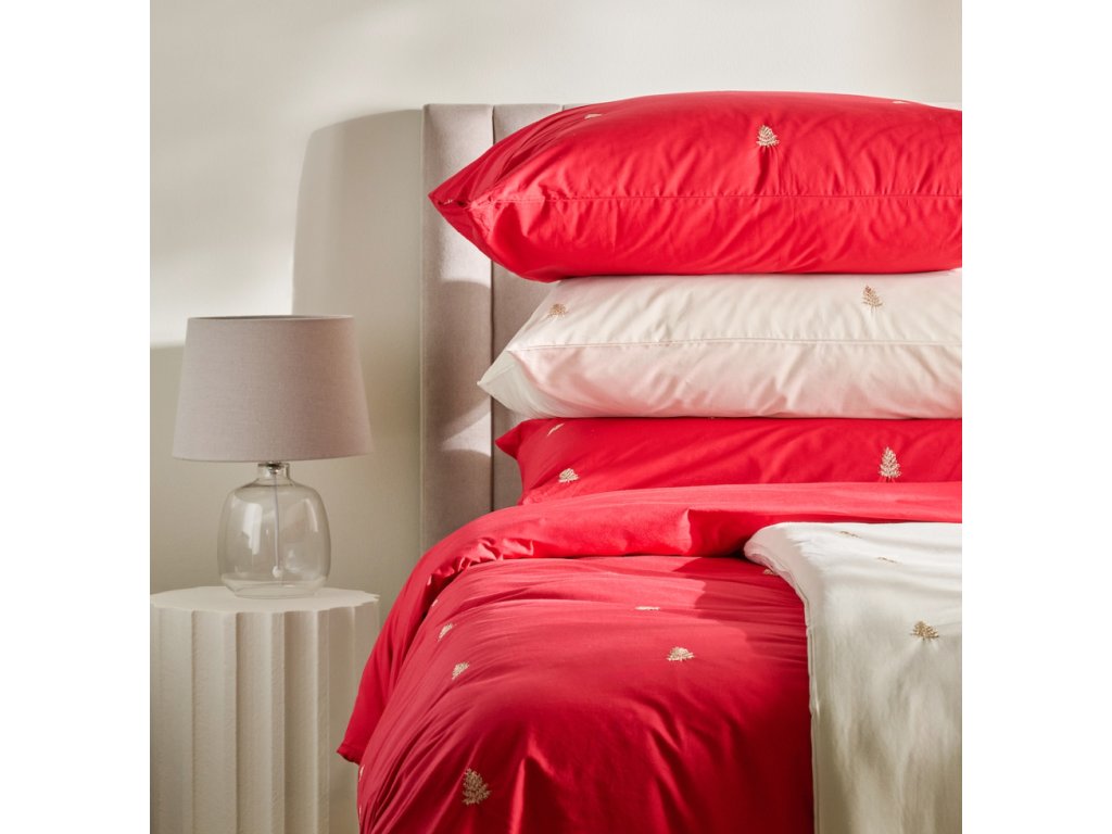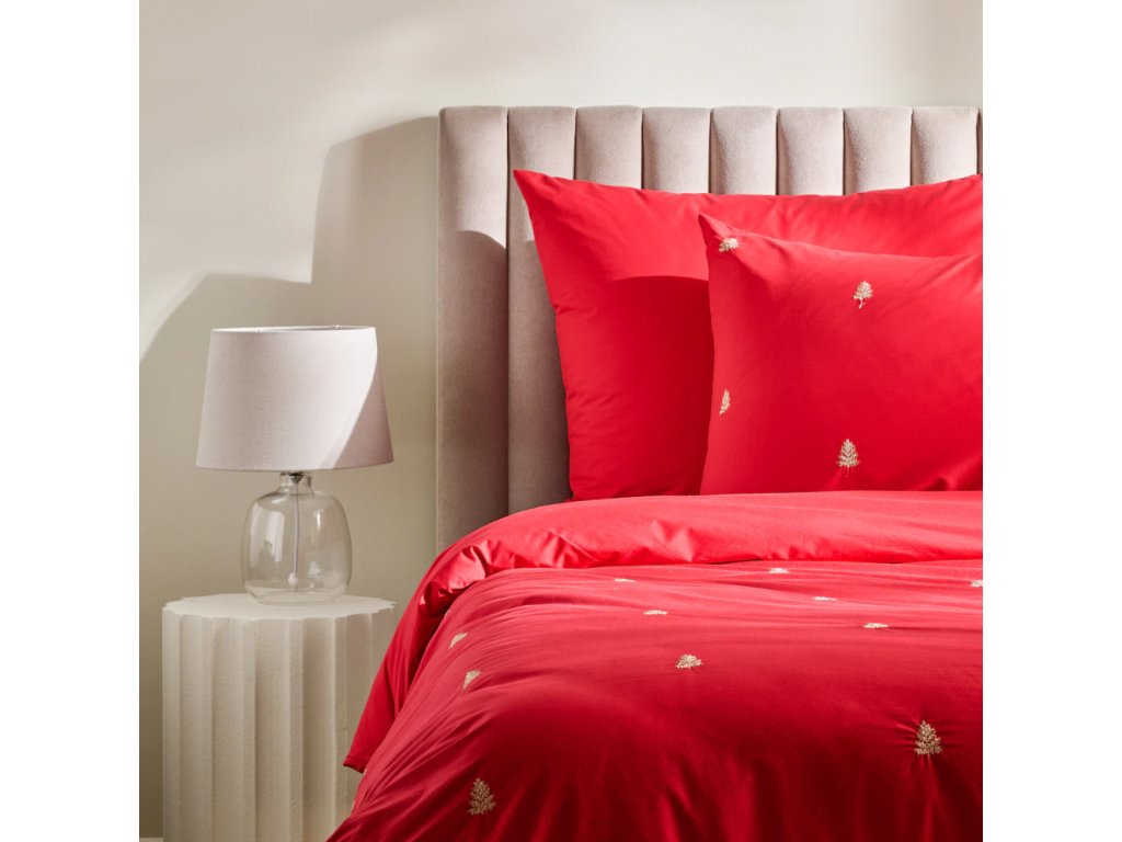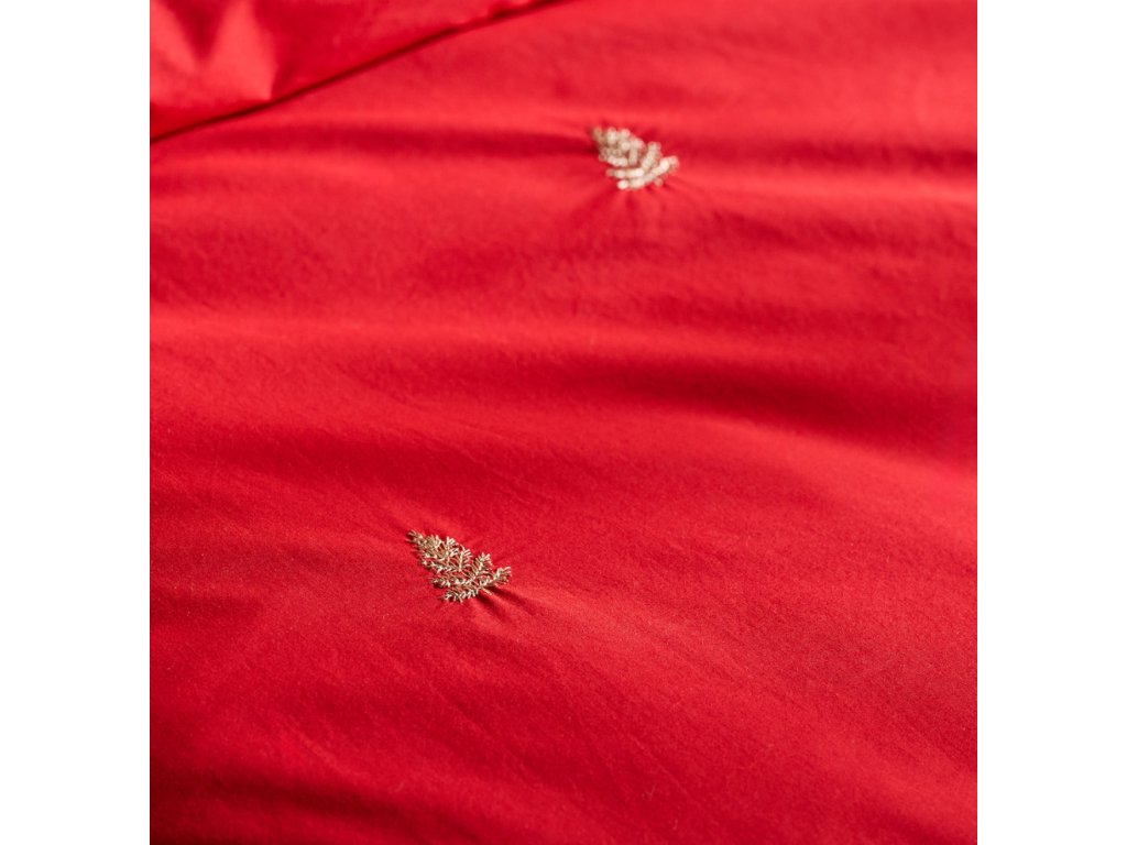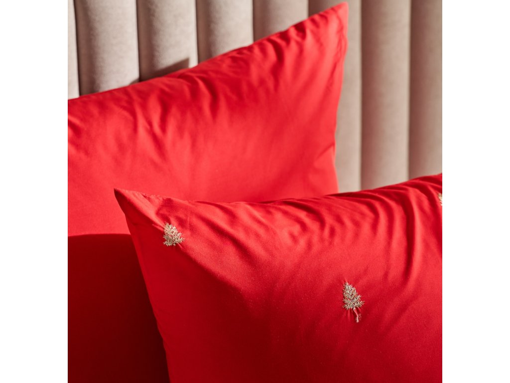 Táto červená posteľná bielizeň je vyrobená zo 100% bavlny, ktorá zaručuje pohodlie a priedušnosť. Jej sýta farba je v kontraste s jemnými zlatými výšivkami v tvare vianočných stromčekov, ktoré dodávajú celku slávnostný nádych v štýle glamour.