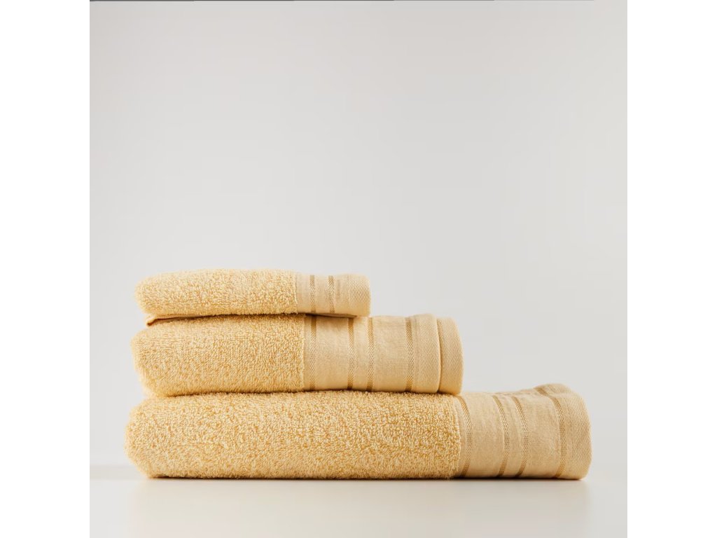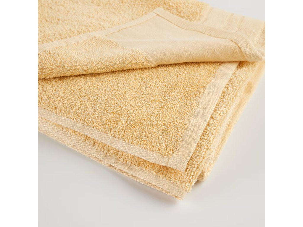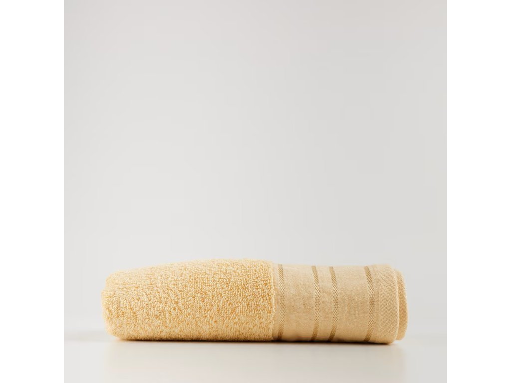 Žltý uterák z bavlny a viskózy je mimoriadne savý a mäkký produkt, ideálny na každodenné použitie. Kombinácia materiálov zaisťuje vynikajúcu absorpciu vlhkosti a je príjemná na dotyk. Odtieň dodáva uteráku elegantný a nadčasový vzhľad a jeho veľkosť umožňuje pohodlné používanie v kúpeľni aj pri kúpaní či relaxácii.