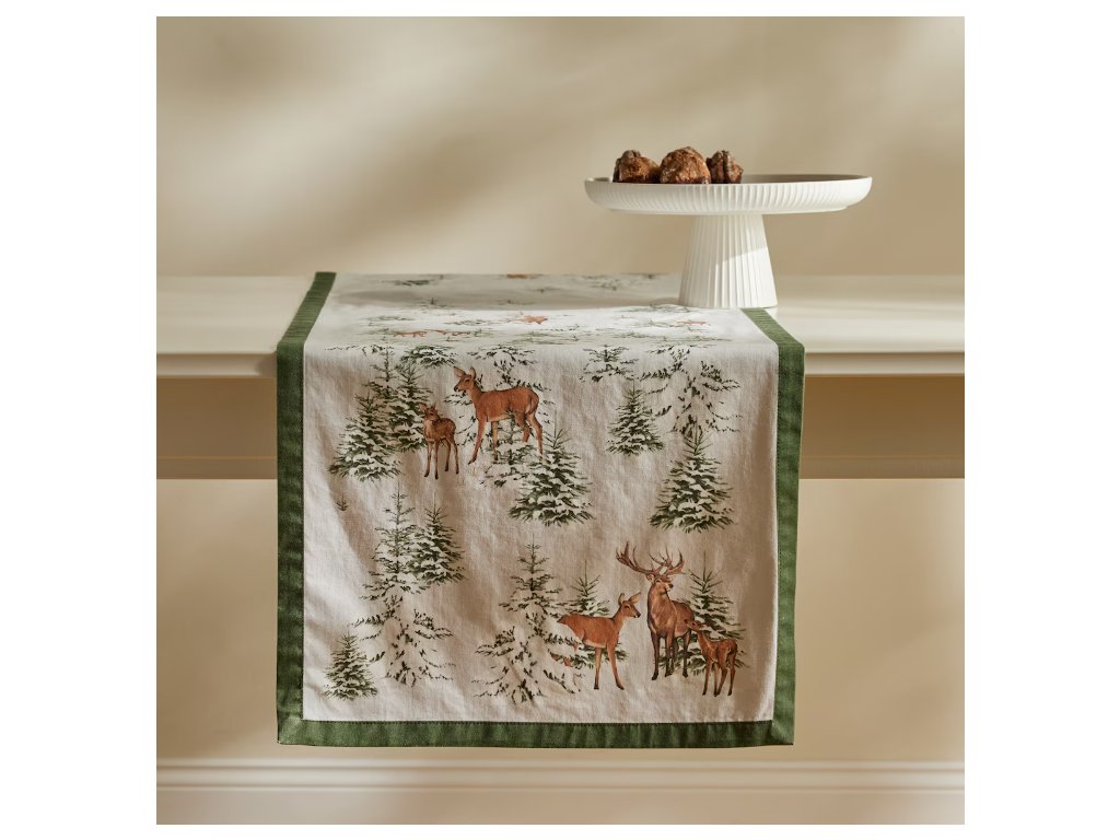 Svetlosivý behúň ozdobený detailným lesným motívom s jeleňmi a borovicami v tónoch zelenej a hnedej farby dokonale oživí každý stôl. Dodatočné tmavozelené obšitie podčiarkuje eleganciu vzoru. Projekt ideálne doplní aranžmány v škandinávskom, klasickom či rustikálnom štýle, osvedčí sa ako na každý deň, tak aj počas sezónnych stretnutí, alebo ako originálny darček.