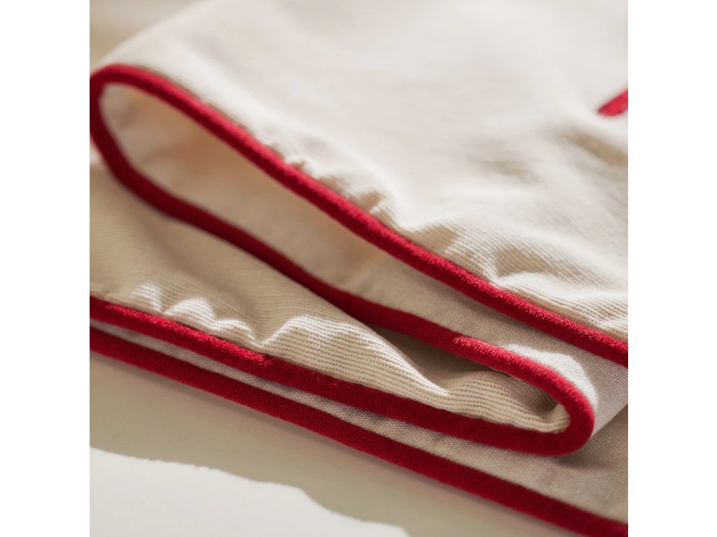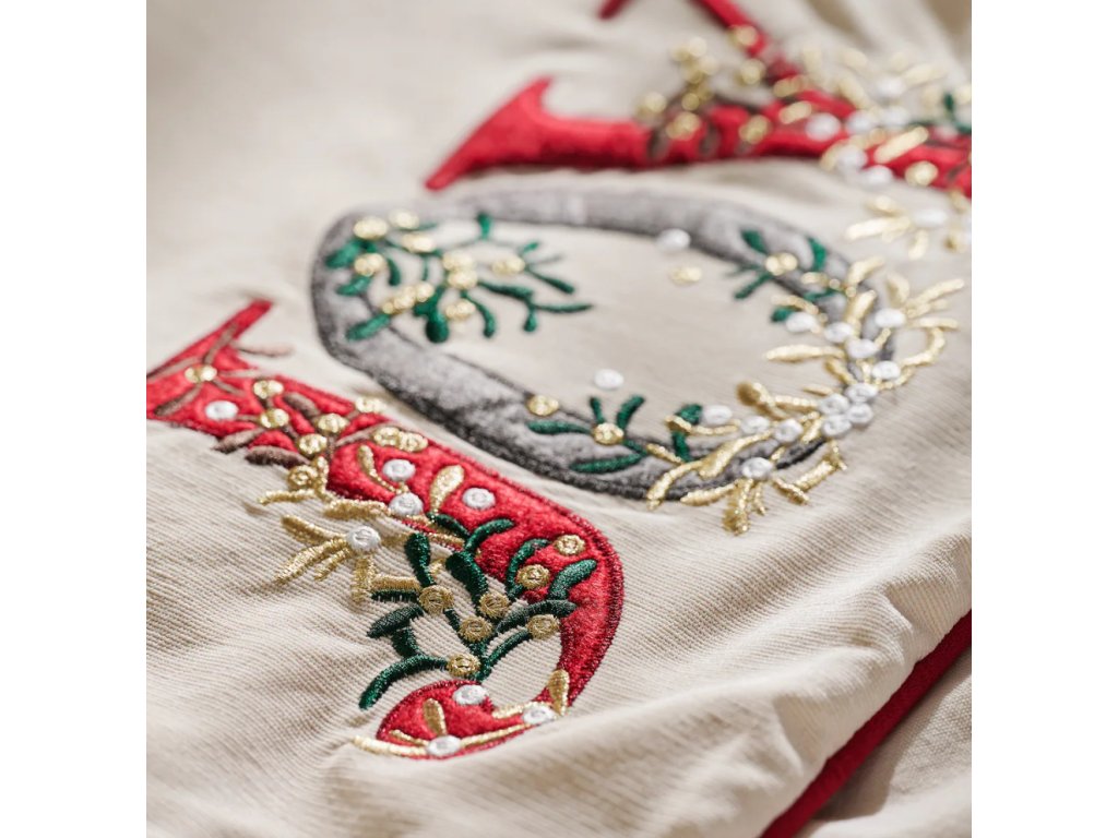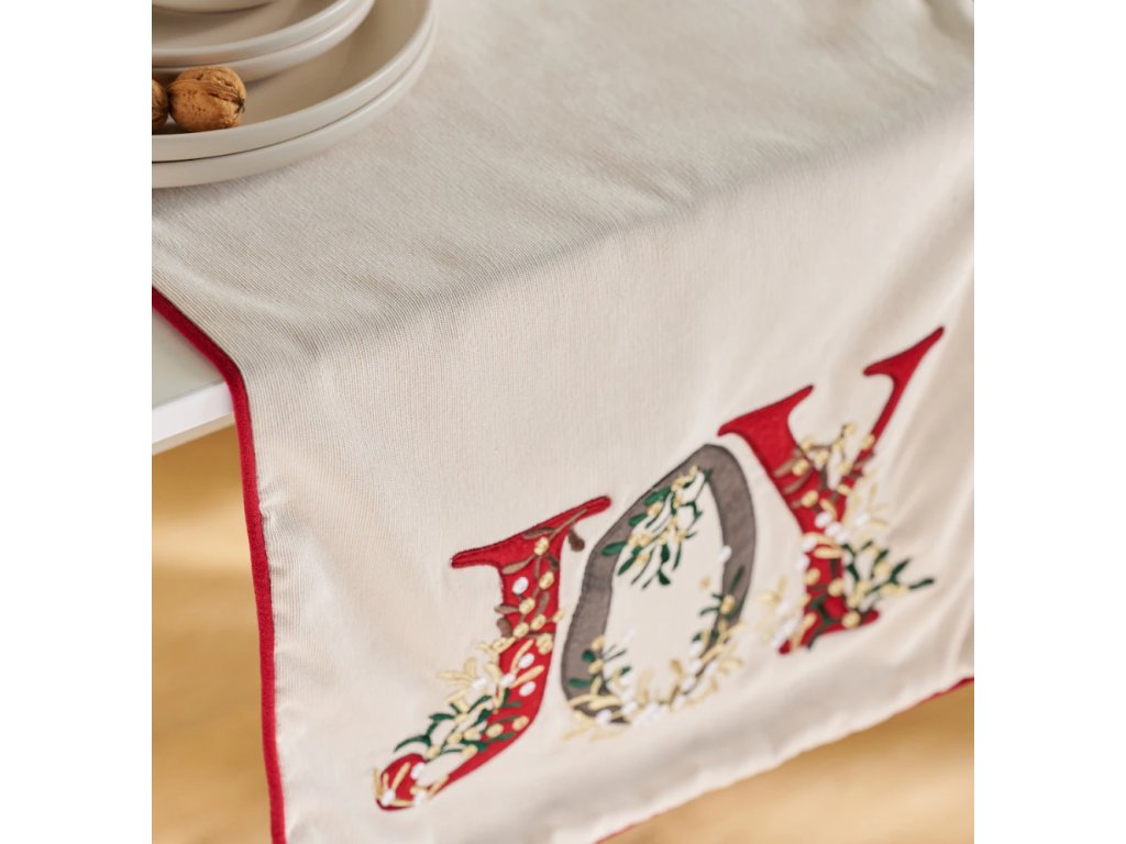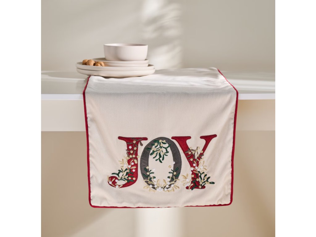 Behúň je ladený v svetlých, krémových tónoch s výraznou, červenou výšivkou znázorňujúcou sviatočný nápis „JOY“ obklopený rastlinnými motívmi. Štýlová, červená lemovka a bohaté detaily výšivky robia z neho ideálnu voľbu pre moderné, klasické či škandinávske aranžmány stola. Dokonale sa osvedčí ako sviatočná dekorácia, každodenná ozdoba alebo vkusný darček pre blízku osobu.