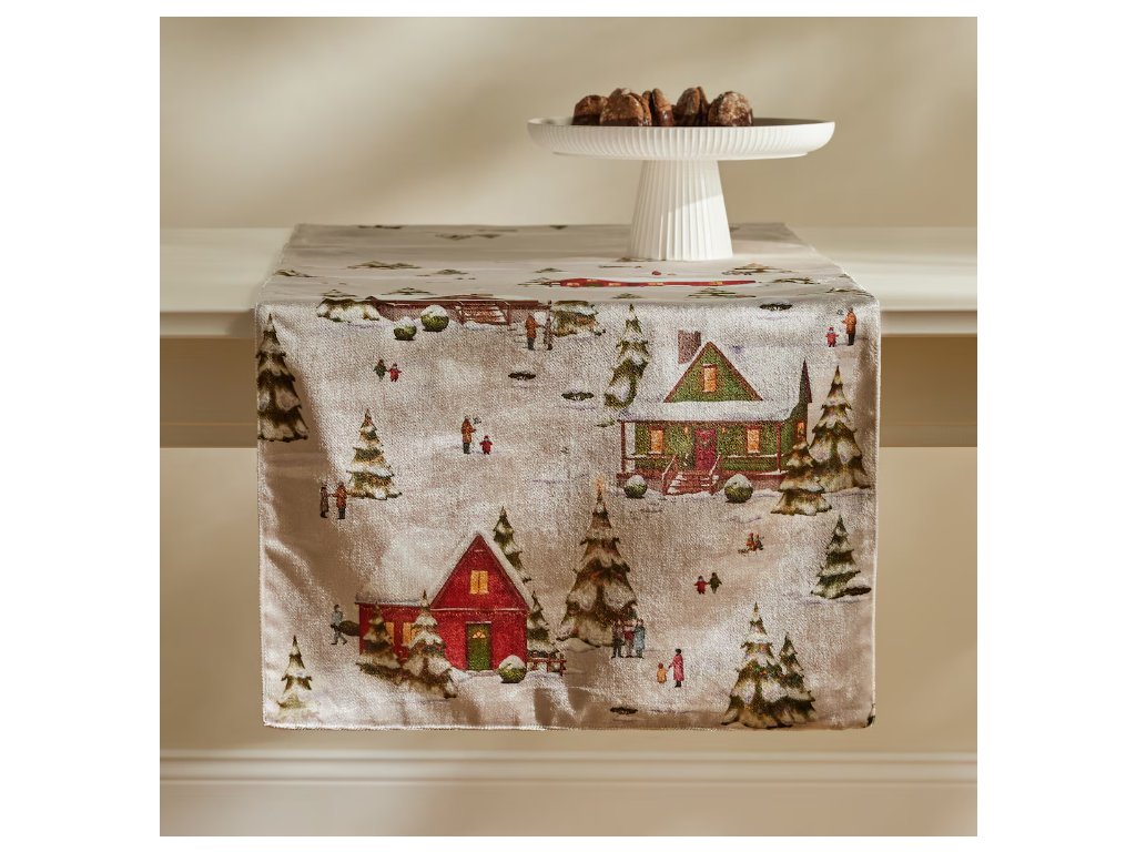 Tónovaný odtieň ecru a potlač znázorňujúca zimnú krajinu s domčekmi, vianočnými stromčekmi a siluetami ľudí spôsobujú, že behúň s potlačou winhurst sa dokonale hodí do sviatočných a zimných aranžmánov. Farebné detaily v zelenej a červenej farbe priťahujú zrak a dodávajú interiéru útulnú atmosféru. Behúň bude krásnou dekoráciou stola tak počas rodinných vianočných stretnutí, ako aj na každý deň. Je to tiež skvelý nápad na praktický darček.