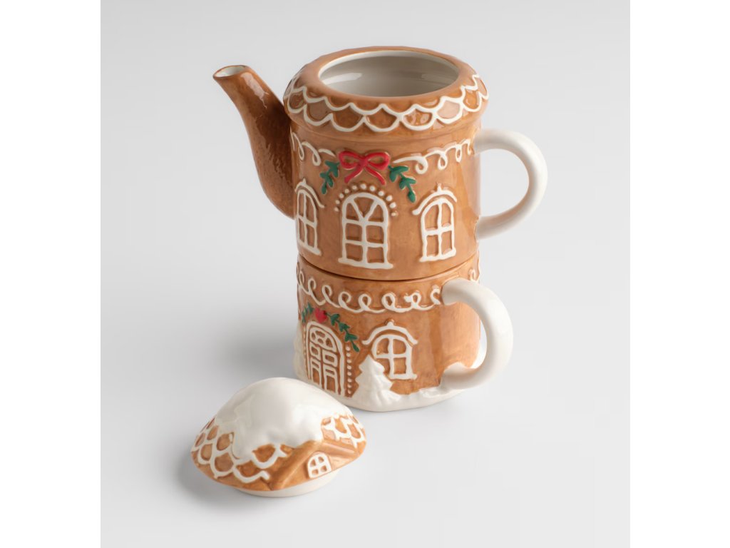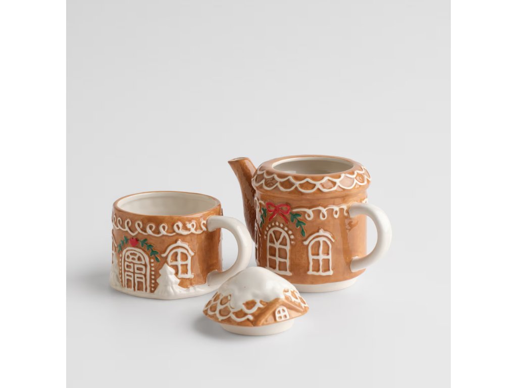 Táto jedinečná keramická súprava Gingerhousi je skutočným stelesnením zimného šarmu. Skladá sa z čajníka a šálky, ktoré sú navrhnuté tak, aby sa dali stohovať, čím vytvárajú roztomilý medovníkový domček so zasneženou strechou.