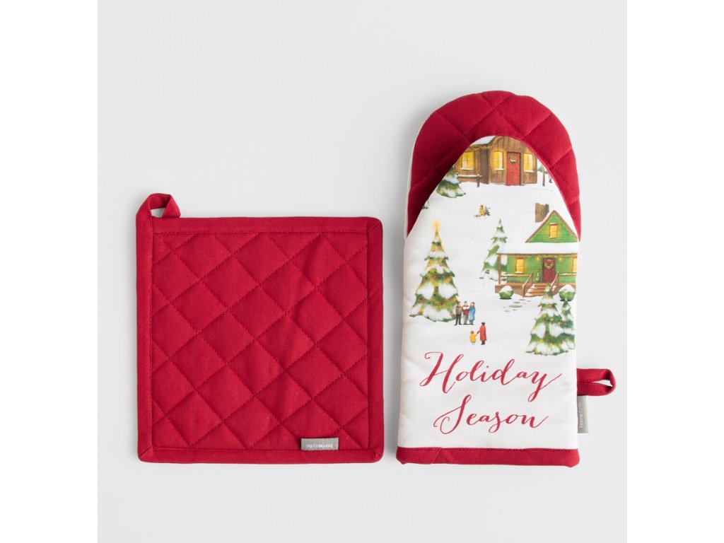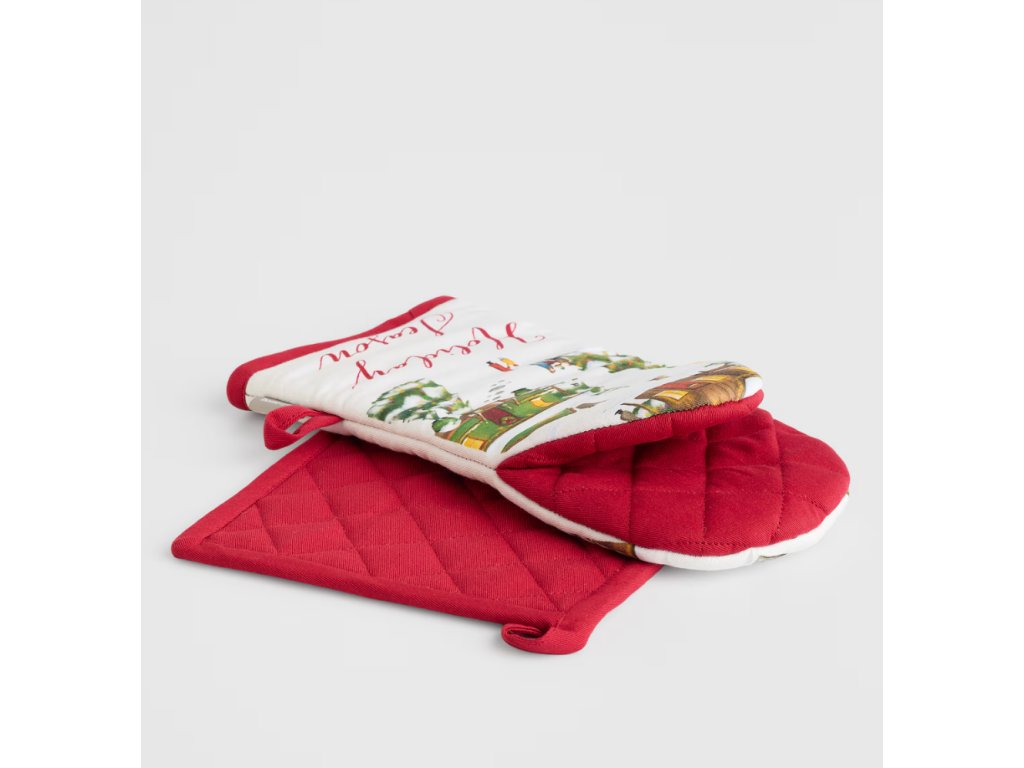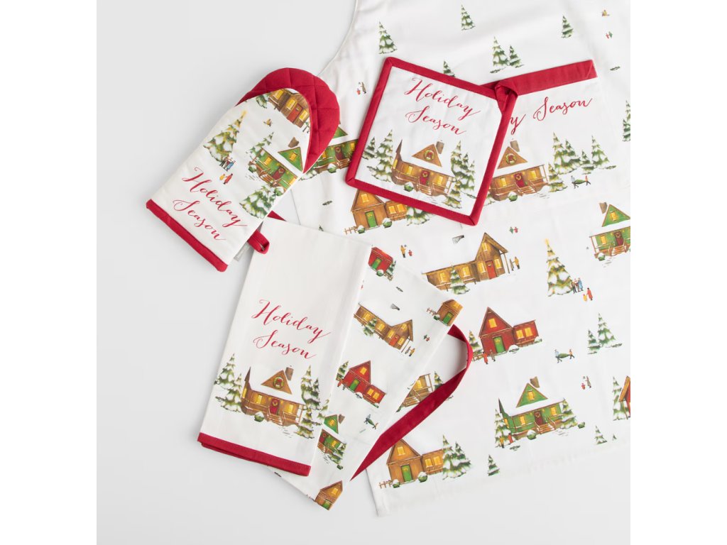 Svetlá béžová farba a decentný, sviatočný motív so zimnou krajinou spôsobujú, že súprava Winhurst sa krásne hodí do každého interiéru – tak moderného, ako aj klasického. Červené lemovanie a nápis „Holiday Season“ jej dodávajú štýlový, útulný charakter a unikátny vzor ju robí skvelým nápadom na darček pre milovníkov varenia a dekoratívnych doplnkov do kuchyne. Produkt sa dokonale kombinuje s inými kuchynskými textíliami.
