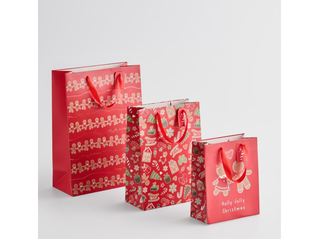 Zabaľte svoje vianočné prekvapenia s tradičným a veselým šarmom do tejto stredne veľkej darčekovej tašky. Táto červená papierová taška s matným vyhotovením je celoplošne zdobená hustým, opakujúcim sa vzorom vianočných motívov, ktoré evokujú domáce medovníkové pečenie a vianočné sladkosti. Vzor obsahuje medovníkových panáčikov, domčeky, hviezdy, cukríkové palice a stromčeky, všetko v klasických farbách: biela, červená a zelená. Je ideálna na stredné darčeky, vianočné dobroty alebo menšie súpravy a je doplnená lesklými červenými saténovými rúčkami. Taška dokonale podčiarkne tradičný štýl a urobí z odovzdávania darčekov ešte radostnejšiu udalosť.