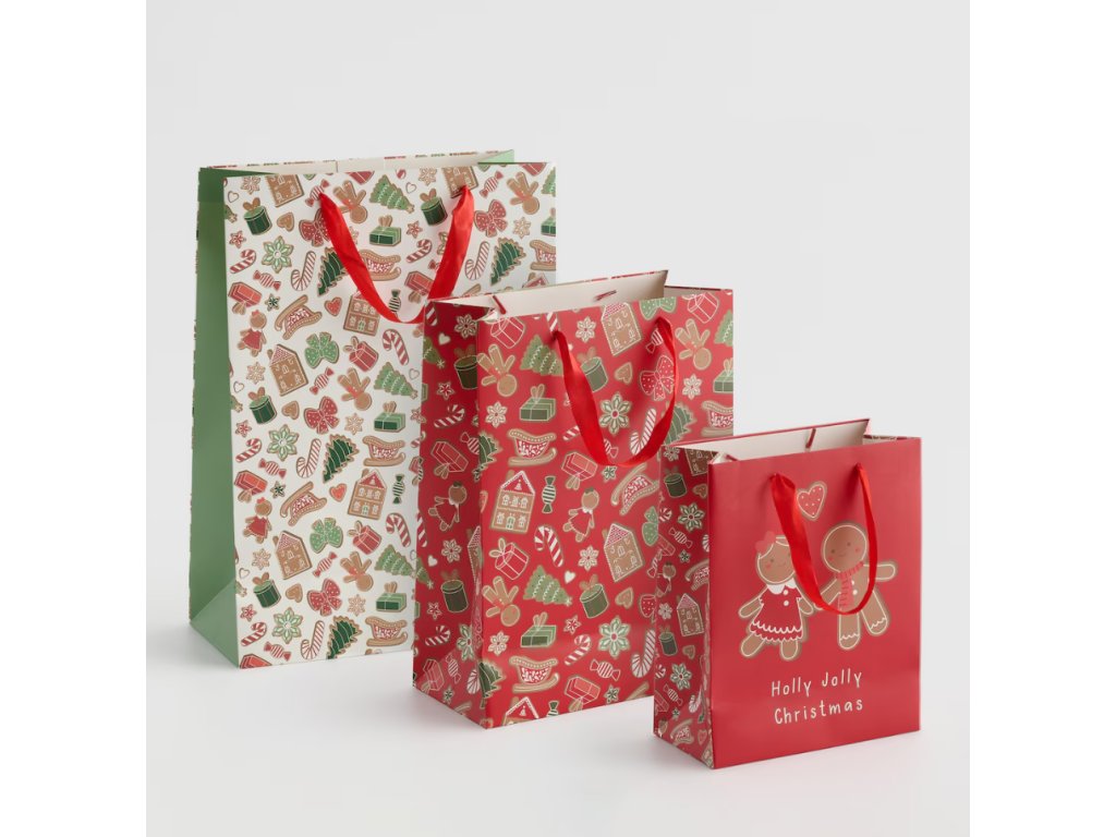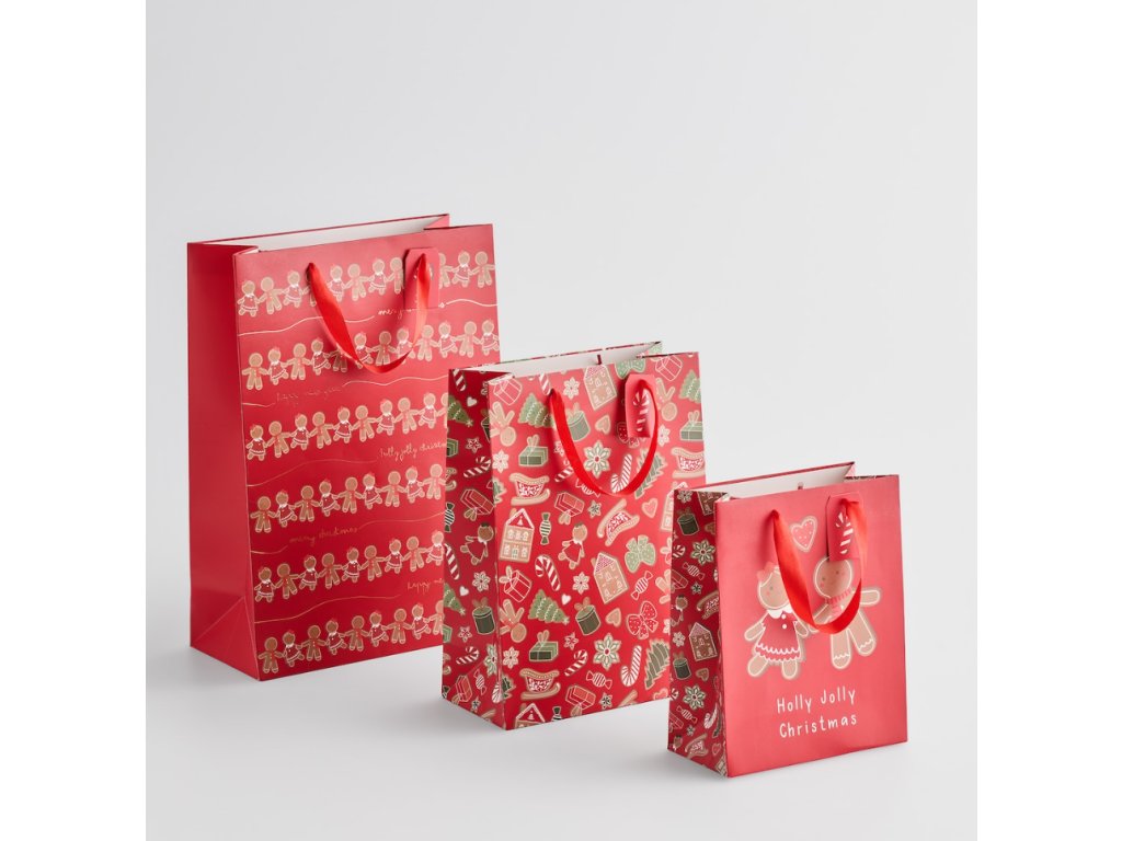 Zabaľte svoje malé a stredné darčeky s rozkošným medovníkovým šarmom do tejto veselej darčekovej tašky. Táto červená papierová taška s matným vyhotovením je ideálna pre menšie vianočné prekvapenia. Prednú stranu zdobí milá ilustrácia medovníkového páru (chlapec a dievča), ktorí sa držia za ruky a pod nimi je nápis „Holly Jolly Christmas“. Bočné strany a zadná časť sú pokryté hustým vzorom medovníkov a cukríkov. Vďaka lesklým červeným saténovým rúčkam a hravému dizajnu je taška pripravená na okamžité odovzdanie darčeka a dokonale zapadá do tradičnej a útulnej vianočnej atmosféry.