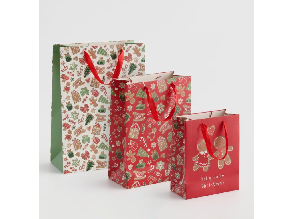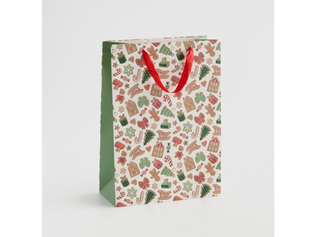 Zabaľte svoje darčeky s láskou do tejto štýlovej papierovej tašky, ktorá okamžite navodí tú pravú sviatočnú náladu! Darčeková taška Ginno je vyrobená z pevného matného papiera a zdobená hravým, no tradičným motívom. Povrch tašky (s bielou alebo svetlou základnou farbou) je pokrytý vzorom medovníkov, vianočných stromčekov, darčekov a cukríkových palíc v klasických farbách: hnedá, červená a zelená. Taška je dostatočne veľká na stredné až väčšie darčeky a je vybavená saténovými rúčkami v kontrastnej červenej farbe. Vďaka tomuto motívu je obdarovanie hotových vianočných dobrôt alebo iných prekvapení ešte radostnejšie.