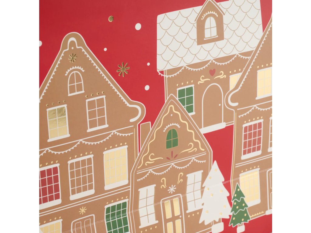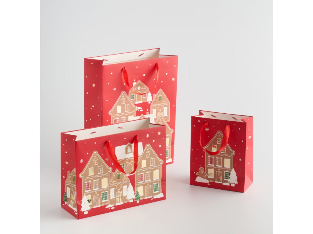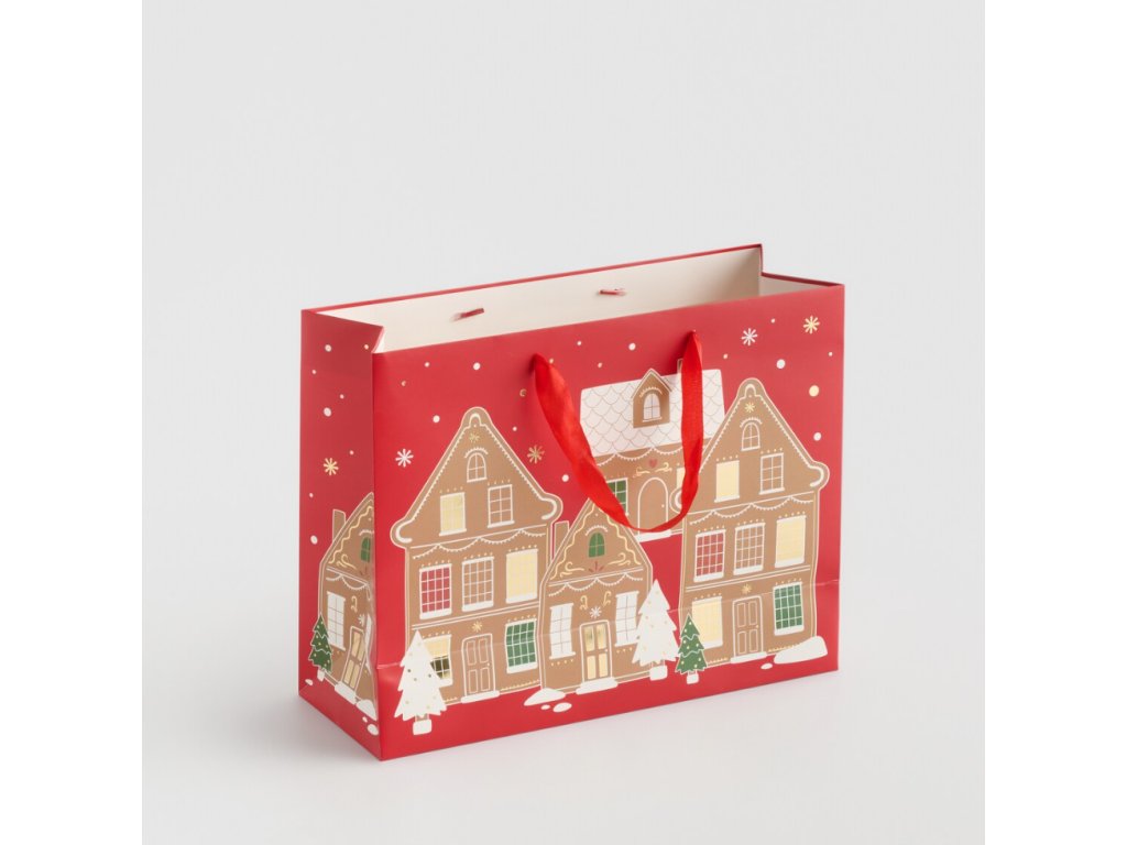 Zabaľte svoje vianočné prekvapenia s tradičným šarmom do tejto menšej darčekovej tašky, ktorá je sama o sebe sviatočnou dekoráciou. Táto červená papierová taška je ideálna na stredné darčeky alebo menšie súpravy a je husto zdobená roztomilými ilustráciami medovníkových domčekov a chalúpok zasypaných snehom, ktoré vytvárajú čarovnú zimnú uličku. Domčeky sú detailne vykreslené v hnedých a bielych tónoch, čo v kombinácii s červeným pozadím dokonale evokuje tradičný vianočný štýl. Taška je doplnená lesklými červenými saténovými rúčkami a je skvelým a praktickým spôsobom, ako odovzdať darčeky s vianočným úsmevom.
