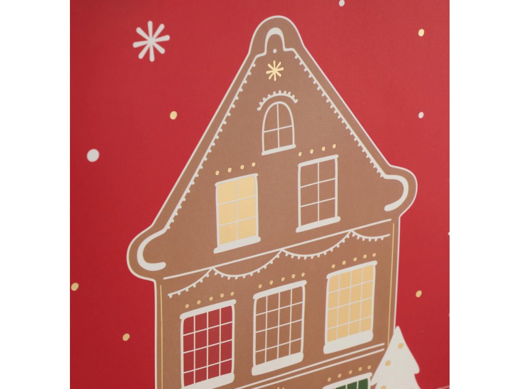 Zabaľte svoje malé vianočné darčeky do tašky, ktorá okamžite navodí rozprávkovú sviatočnú atmosféru. Táto červená papierová taška je ideálna na menšie prekvapenia, darčekové karty alebo drobné vianočné pochúťky. Prednú stranu zdobí výrazná a detailná ilustrácia veľkého medovníkového domčeka so svietiacimi oknami, zasneženou strechou a priateľským medovníkovým panáčikom stojacim vedľa vianočného stromčeka. Bočné strany sú potlačené minimalistickým vzorom snehových vločiek. Vďaka lesklým červeným saténovým rúčkam a kúzelnému motívu je taška dokonalým doplnkom k tradičnej vianočnej výzdobe a odovzdávaniu darčekov.