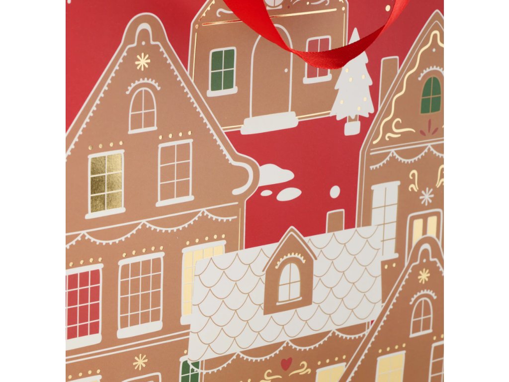 Táto červená papierová taška je skvelá na darčeky a sama o sebe slúži ako krásna vianočná dekorácia. Je celá pokrytá potlačou medovníkových domčekov zasypaných snehom, ktoré vytvárajú čarovnú zimnú dedinku.