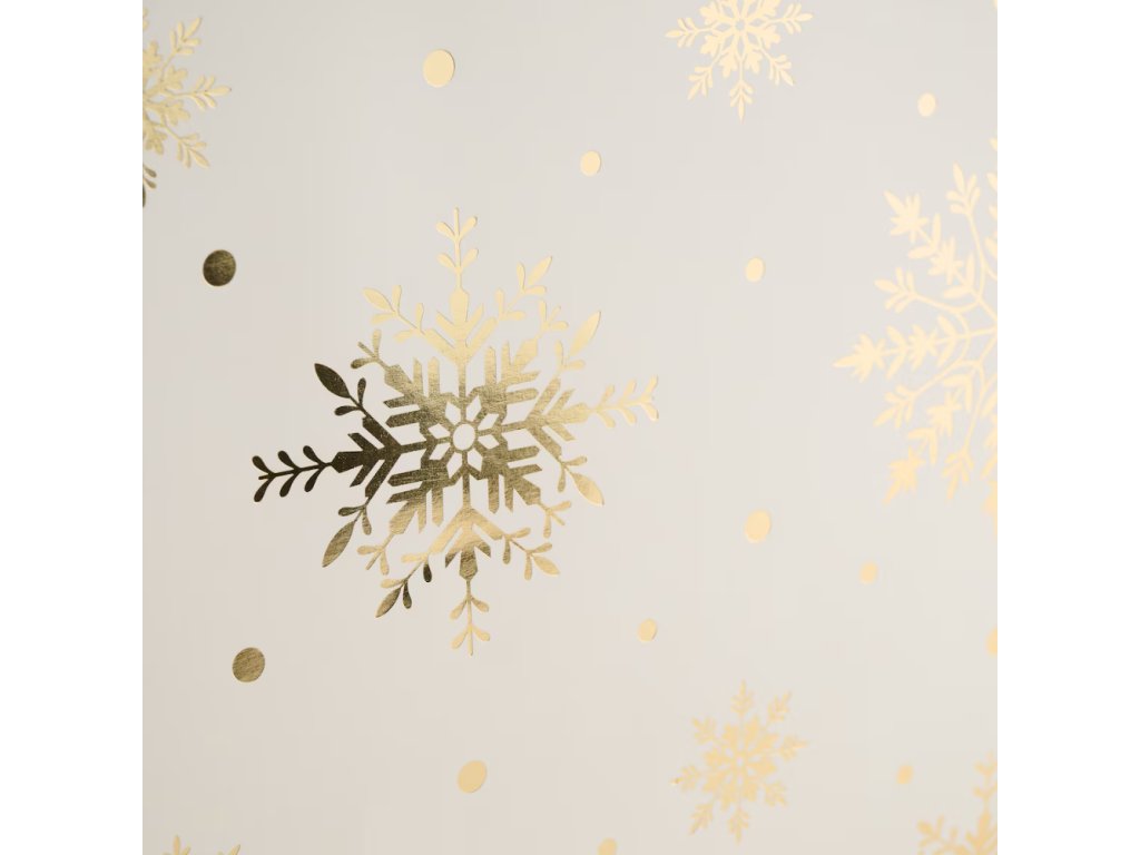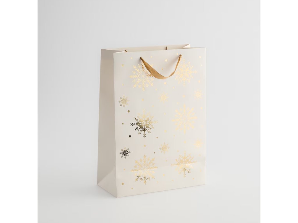 Elegantná darčeková taška v béžovej farbe je ideálnym obalom pre vaše sviatočné dary. Je vyrobená z pevného papiera a zdobená ligotavou zlatou potlačou s motívom snehových vločiek. Táto taška s výškou 42cm a dĺžkou 30cm podčiarkne elegantný štýl každého darčeka a vnesie nádych luxusu do vianočného obdarúvania.