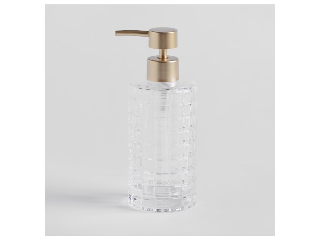 Sklenený dávkovač na mydlo je vycibrený doplnok do každej kúpeľne. Jeho priehľadná fľaša s jemnými razeniami (tlačením) mu dodáva subtilnosť a triedu, čím harmonizuje s rôznymi štýlmi aranžovania kúpeľne. Dávkovacia časť v zlatej farbe dodáva dávkovaču eleganciu a luxusné vyhotovenie. Zlatý akcent mu dáva výnimočný charakter, zdôrazňujúc jeho vysokú kvalitu a estetiku. Vďaka pevnej konštrukcii a precíznemu vyhotoveniu je tento dávkovač nielen ozdobou kúpeľne, ale aj praktickým prvkom vybavenia. Zabezpečuje pohodlie a funkčnosť počas každodenných hygienických činností, pridávajúc zároveň eleganciu a štýl do kúpeľňového priestoru.