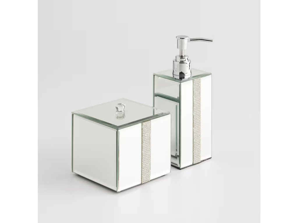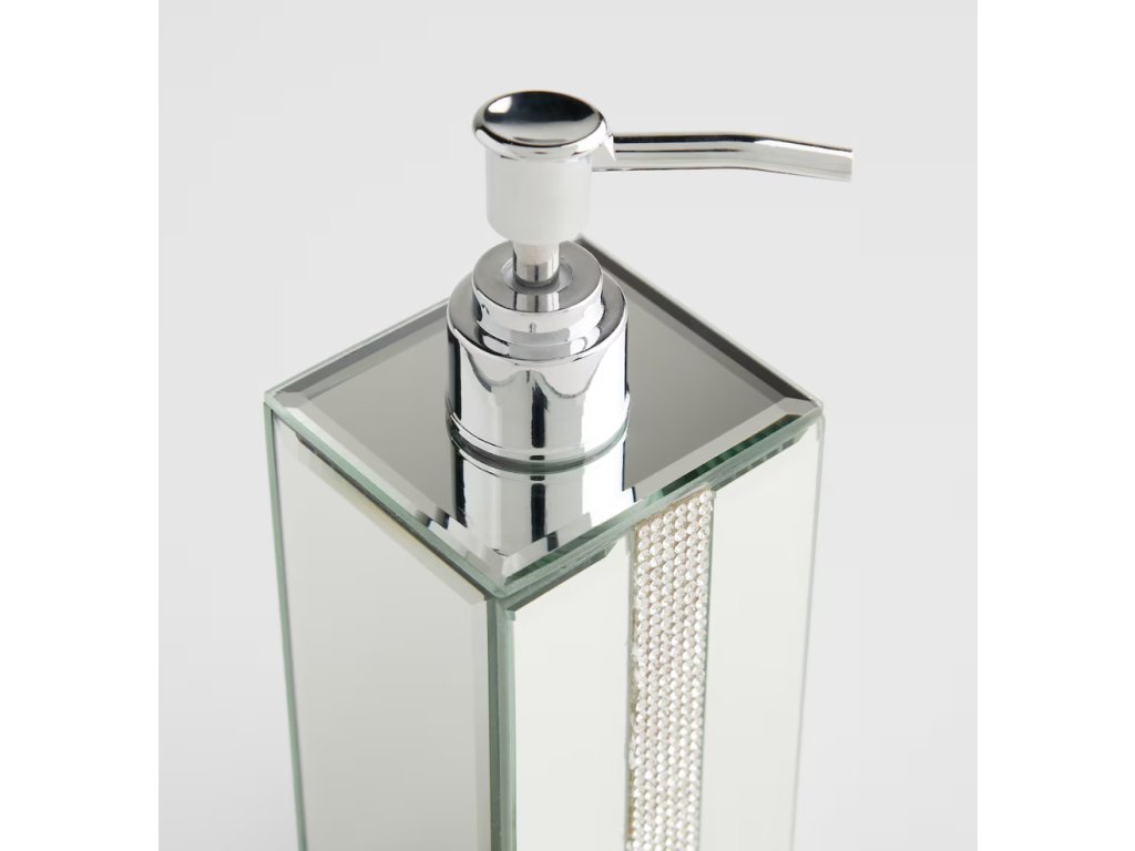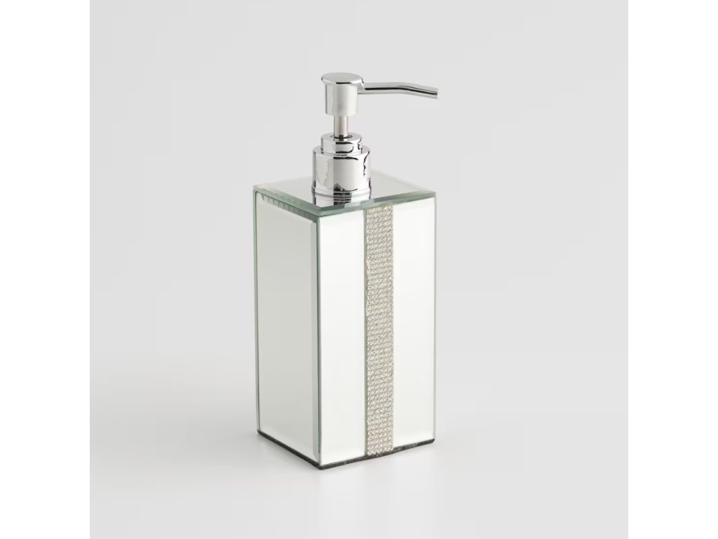 Elegantný dávkovač na mydlo, vyrobený z kombinácie skla a kovu v štýlovej, striebornej farbe. Moderný dizajn zaručuje, že dávkovač sa dokonale hodí k rôznym zariadeniam kúpeľní, od minimalistických po klasické. Je to praktický a estetický prvok vybavenia, ktorý dodá eleganciu každému interiéru.