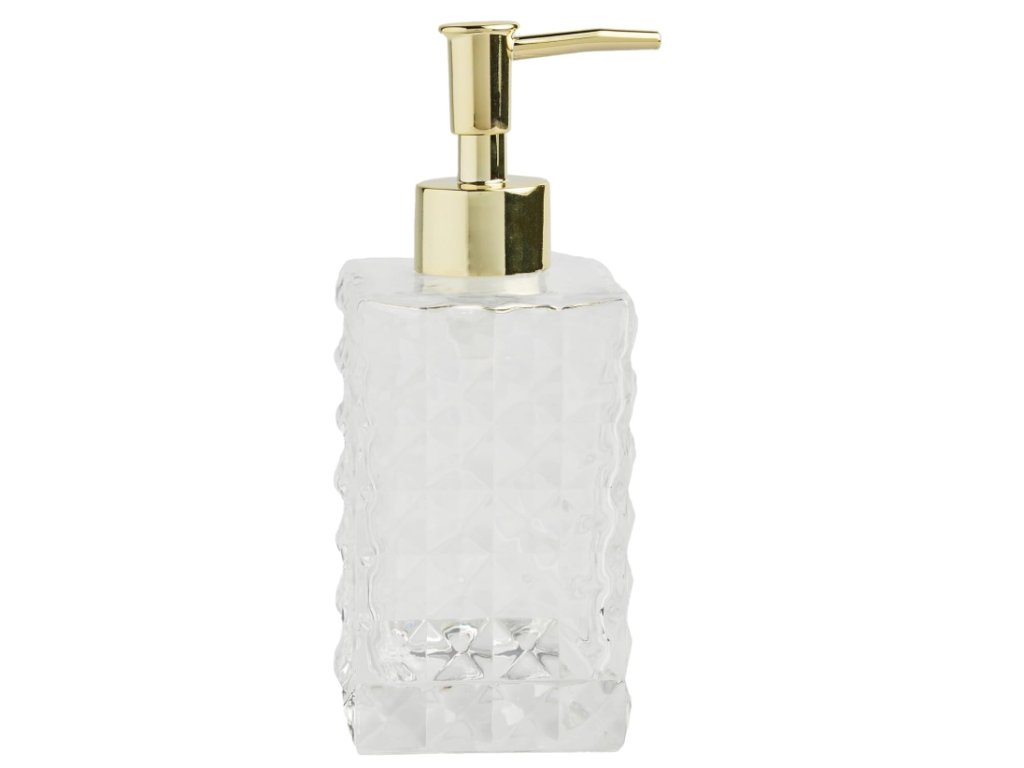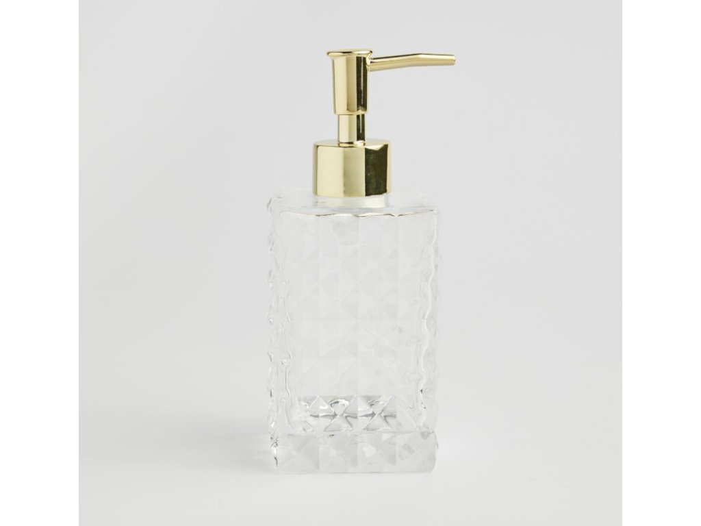 Sklenený dávkovač mydla Sara s jemným diamantovým vzorom a zlatou pumpičkou dodá vašej kúpeľni dotyk elegancie a je štýlovým kúpeľňovým doplnkom.