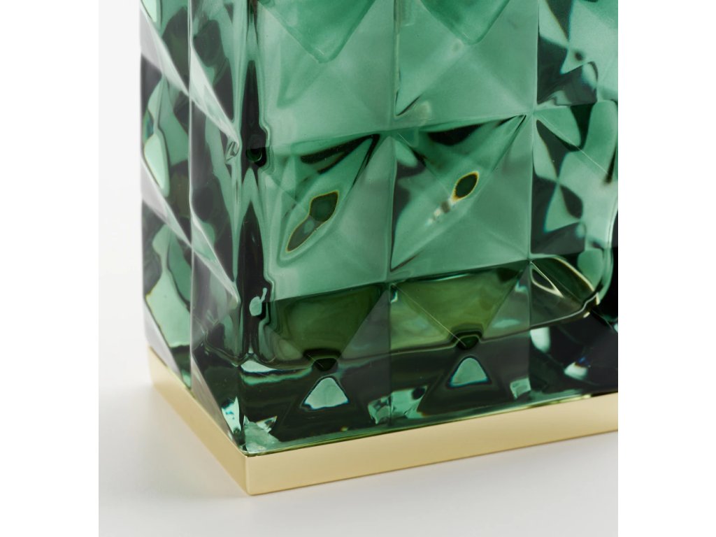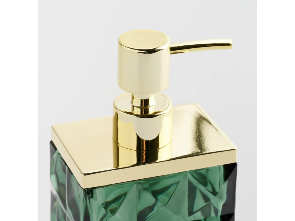 Luxusný kúpeľňový dávkovač Venezio v hlbokom tmavozelenom skle s elegantným fazetovaným (brúseným) povrchom.