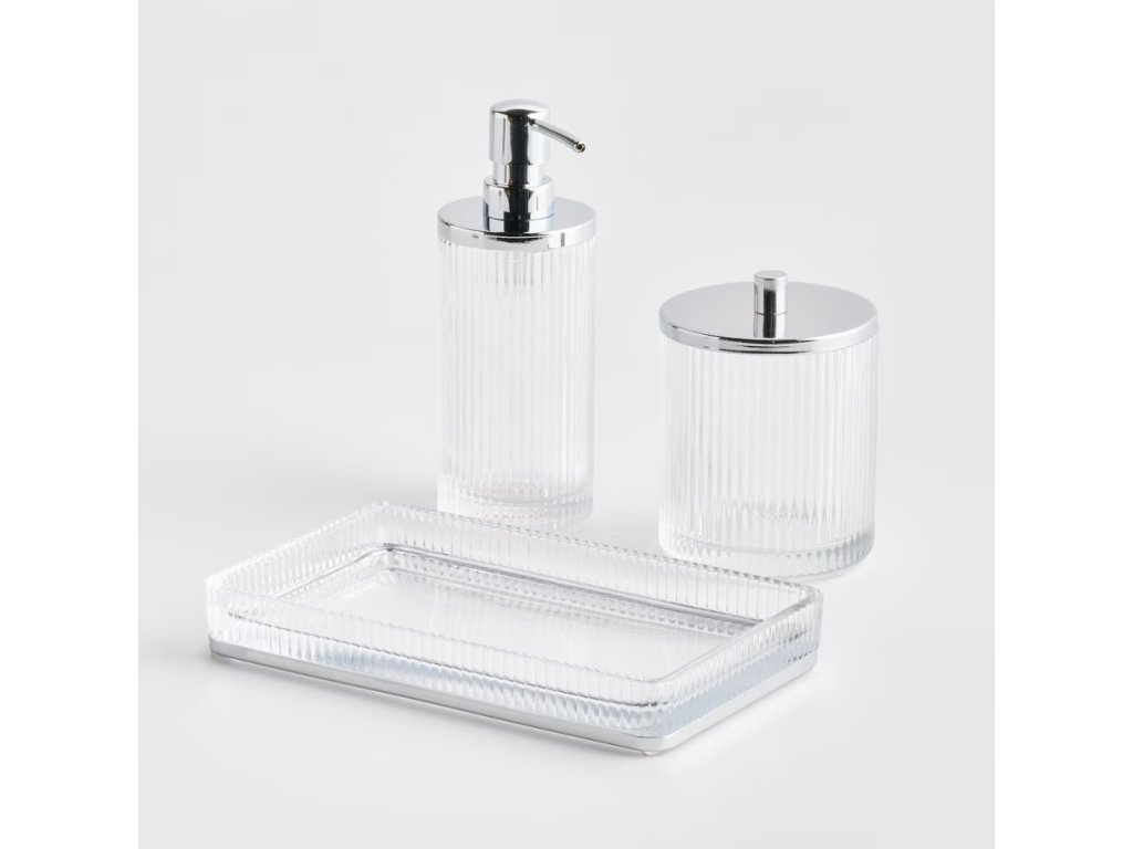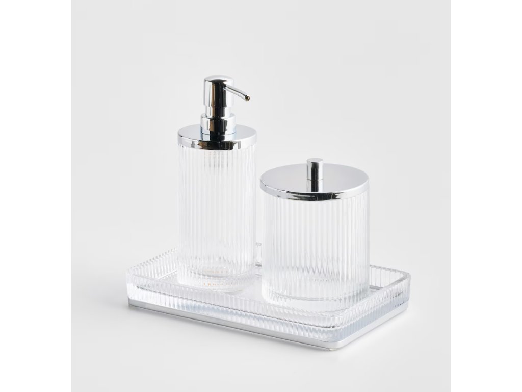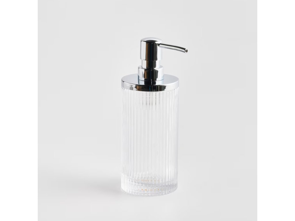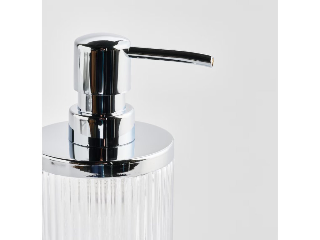 Elegantný kúpeľňový dávkovač zo skla v štýlovej striebornej farbe a s objemom 300 ml. Jeho moderný dizajn spája funkčnosť s estetikou a dokonale zapadne do každej kúpeľne. Vďaka praktickej pumpičke umožňuje jednoduché a presné dávkovanie mydla, dezinfekčnej tekutiny alebo balzamu. Pevné vyhotovenie zaručuje dlhú životnosť a strieborná povrchová úprava dodáva eleganciu a šmrnc.