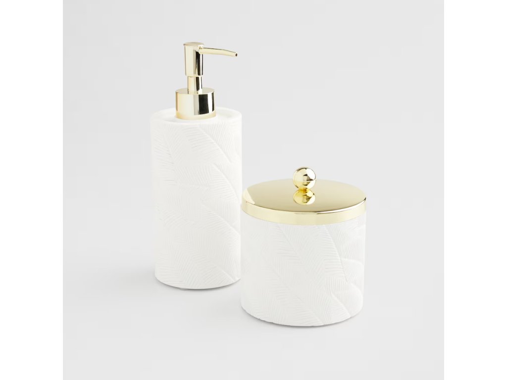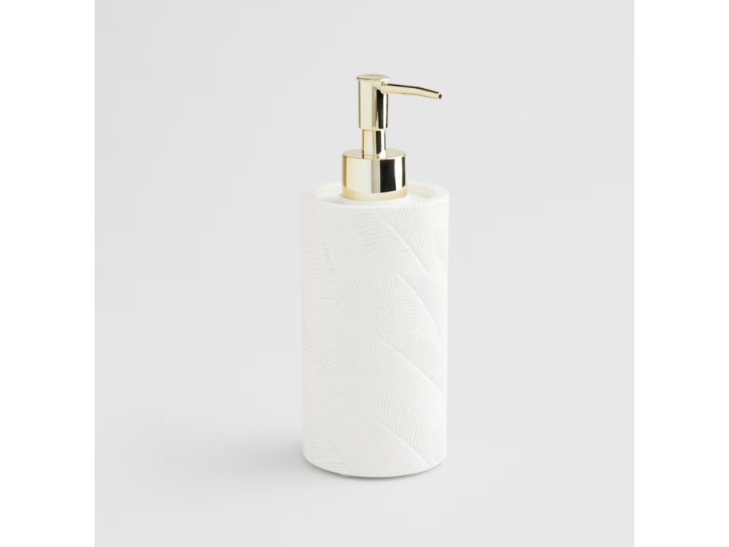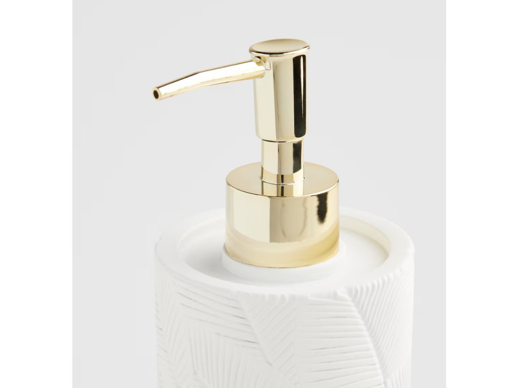 Moderný a elegantný dávkovač mydla Leafy s objemom 300 ml. Jeho biele telo zo živicovej hmoty zdobí jemný, textúrovaný motív listov, ktorý pôsobí prirodzene a minimalisticky. Zlatá pumpa dodáva dávkovaču nádych luxusu a elegancie. Tento dávkovač je ideálny pre tekuté mydlá a pleťové mlieka, a dokonale sa hodí do kúpeľne, kuchyne či na toaletný stolík, kde sa stane nielen praktickým pomocníkom, ale aj štýlovým doplnkom.