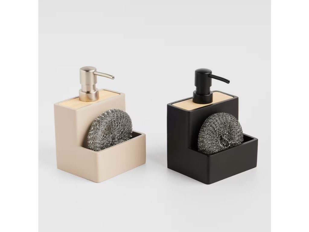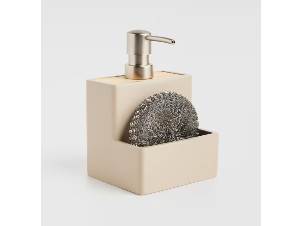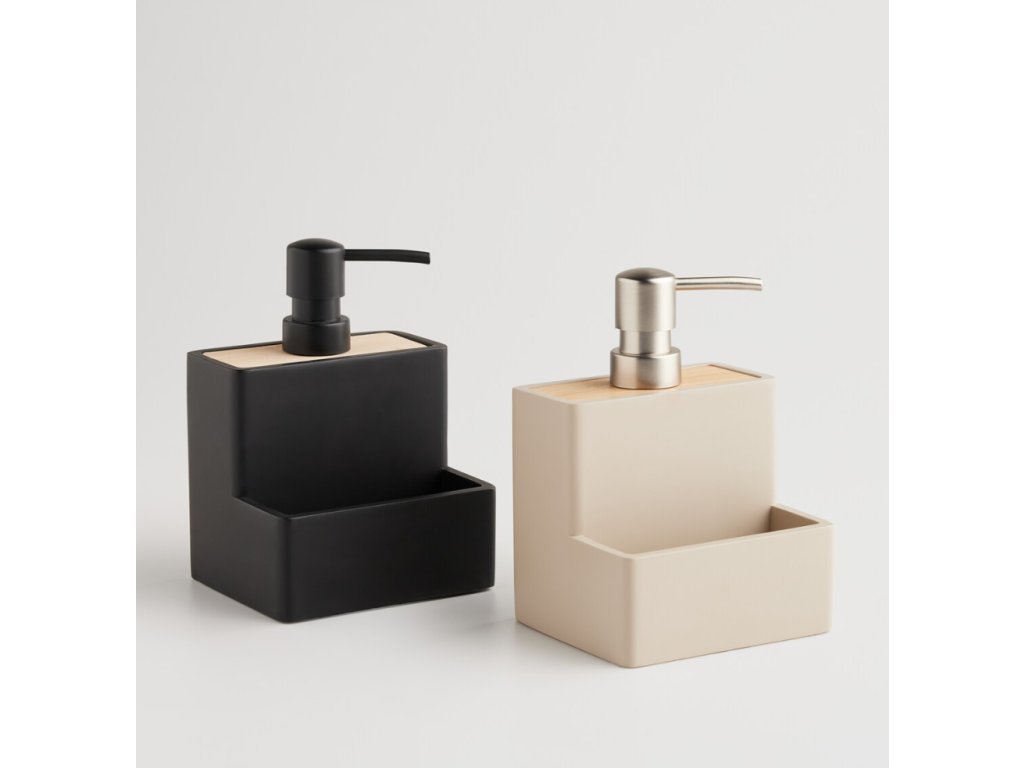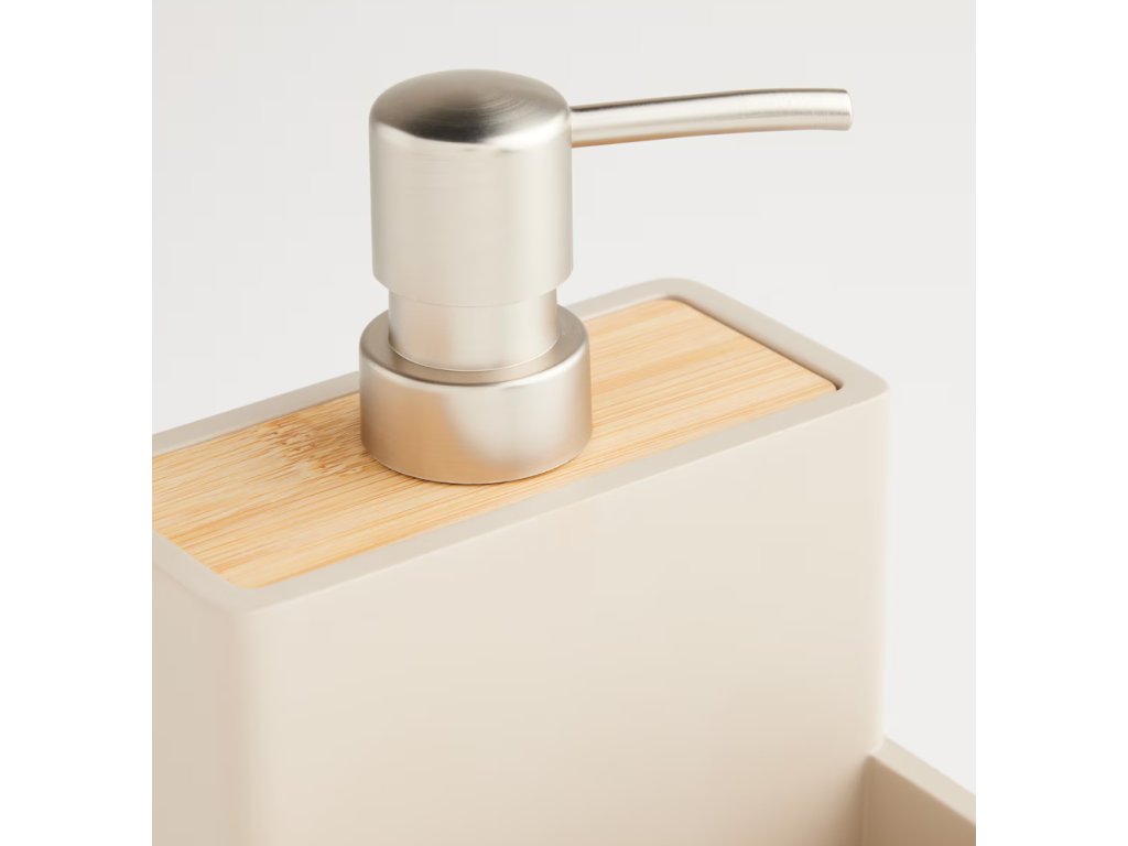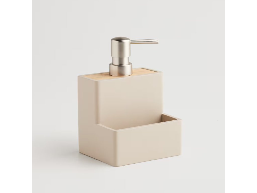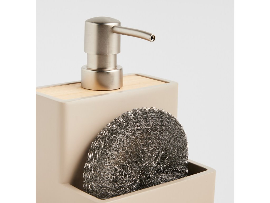 Dávkovač so špongiou Vastos v industriálnom štýle je praktickým a elegantným doplnkom do vašej kuchyne alebo kúpeľne. Súprava obsahuje béžový dávkovač vyrobený z matnej živicovej hmoty a bambusový detail. Dávkovač má objem 200 ml a je navrhnutý tak, aby sa do neho zmestila aj špongia. Vďaka modernému dizajnu a matnému vyhotoveniu, ktoré sa ľahko čistí, je ideálny na uskladnenie mydla alebo saponátu.