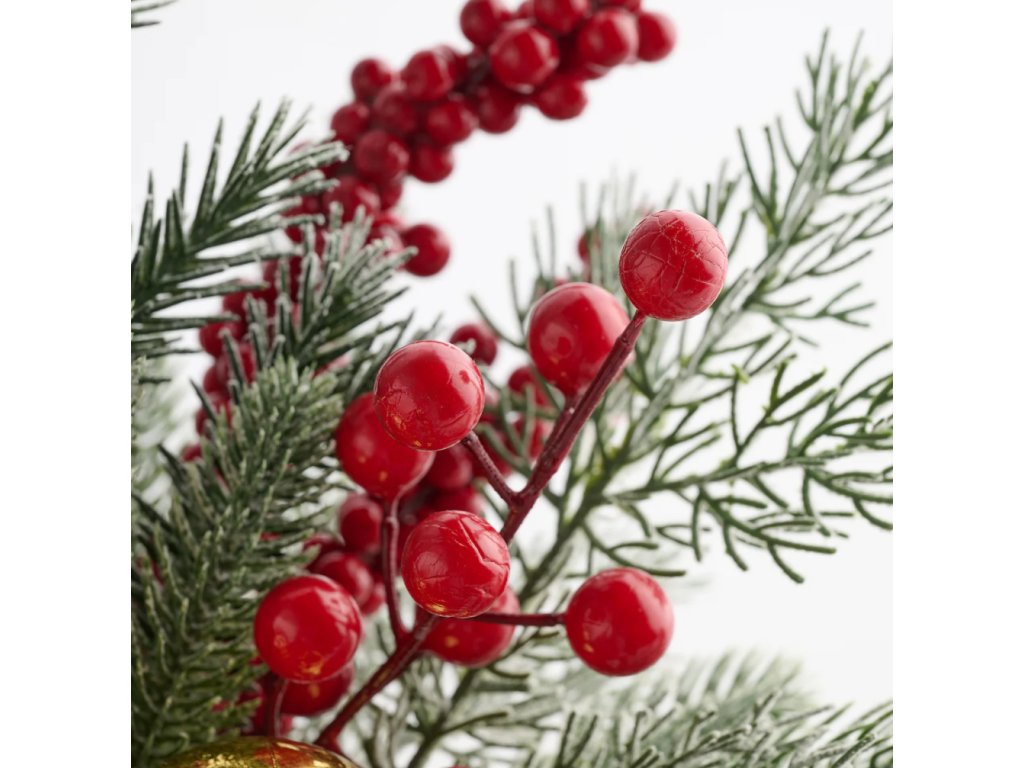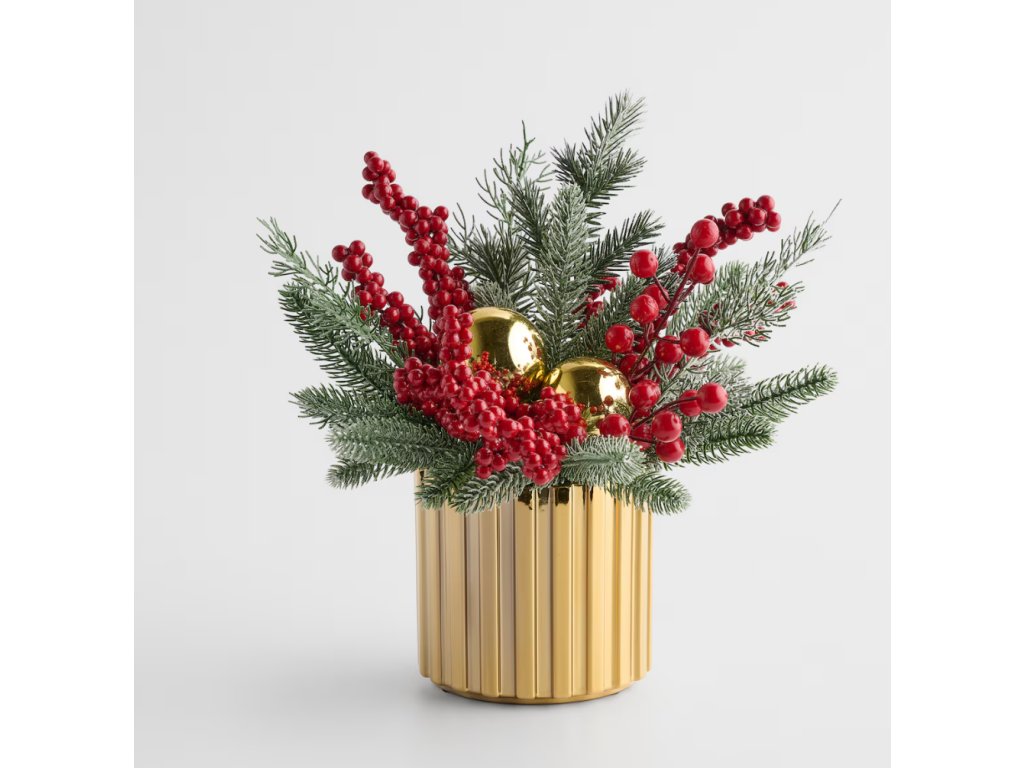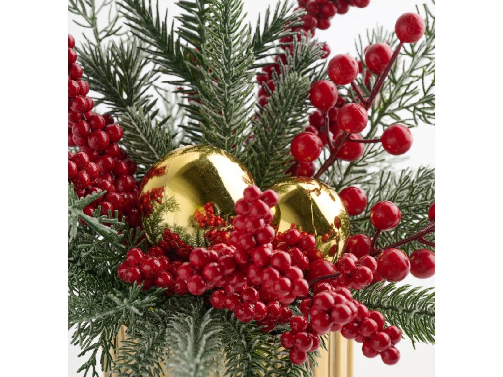 Tormeno: Zlatý lesk a sila červenej. Táto dekorácia vnesie do Vášho domova teplú a radostnú atmosféru Vianoc. Kombinácia zlatého podstavca, mrazom poprášeného ihličia a jasne červených bobúľ vyzerá nádherne pod svetlom sviečok alebo lampy.