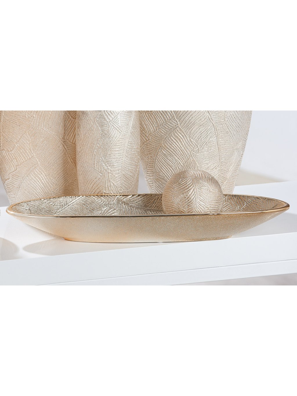 Dekoračná misa Cascade v luxusnom farebnom prevedení šampanské je skutočným umeleckým kúskom pre váš domov. Táto keramická misa s rozmermi 15 x 48,5 x 6 cm vyniká prepracovanou vnútornou textúrou s motívom listov, ktorá v kombinácii s metalickým leskom dodáva priestoru nádych noblesy. Vďaka svojmu podlhovastému tvaru je ideálna ako stredový kúsok na jedálenský stôl alebo štýlový podnos na drobné dekorácie.