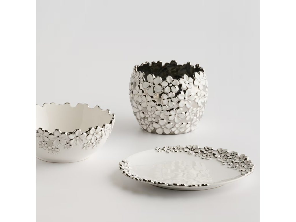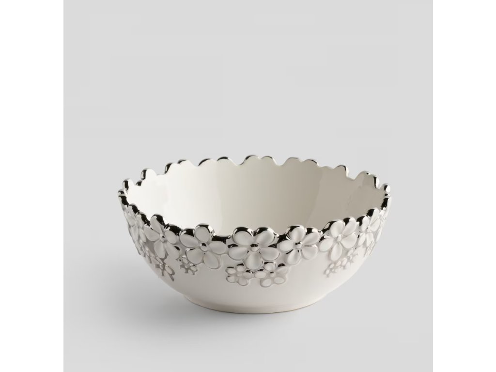 Pôvab bielych kvetov a nádych glamouru. Táto elegantná miska z dolomitu s detailným kvetinovým zdobením a strieborným okrajom je dokonalým akcentom pre váš konferenčný stolík alebo komodu. Nechajte svoj domov rozkvitnúť!