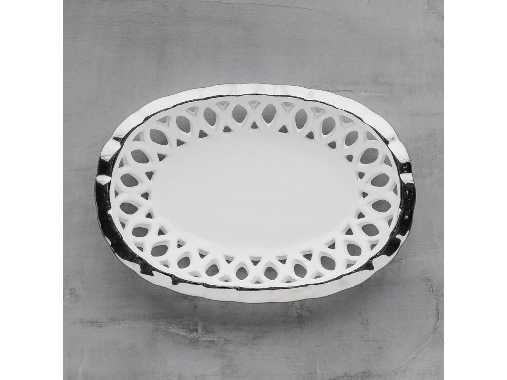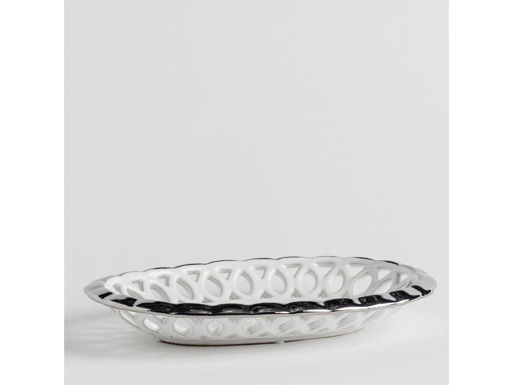 Elegantný oválny podnos z galvanizovanej keramiky v bielej farbe s lesklým strieborným okrajom. Jeho prelamovaný dizajn s kruhovými motívmi dodáva ľahkosť a sofistikovaný vzhľad. Tento dekoratívny kúsok je ideálny ako štýlový doplnok na komody, stoly alebo poličky, kde vnesie jemnú eleganciu a pôvab. Hoci je primárne dekoratívny, jeho vzhľad pripomína tradičné misy na ovocie alebo pečivo.