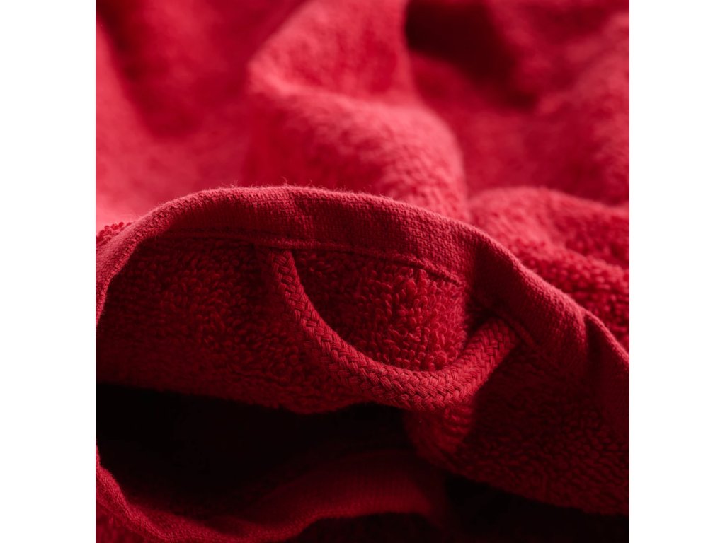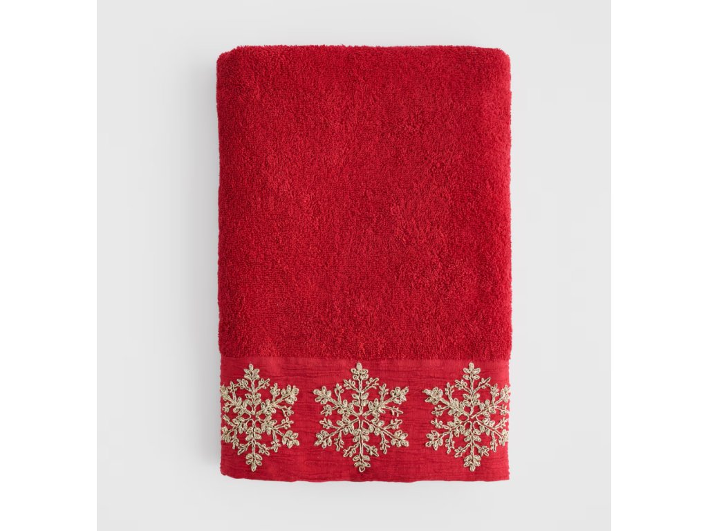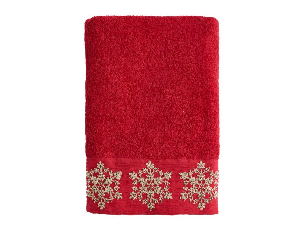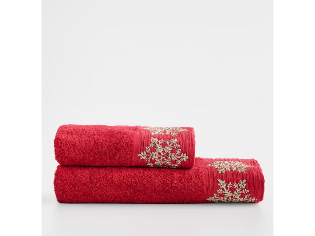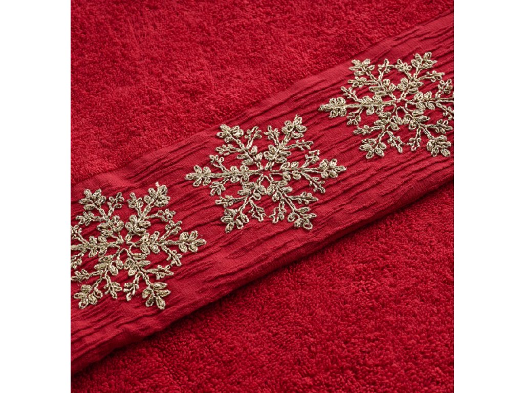 Očarujúci dekoračný uterák Snowy v sýtej červenej farbe okamžite vnesie do kúpeľne vianočnú eleganciu. Je vyrobený z mäkkej bavlny a jeho hlavným ozdobným prvkom je prekrásna, trblietavá výšivka s motívom zlatých snehových vločiek na bordúre.
