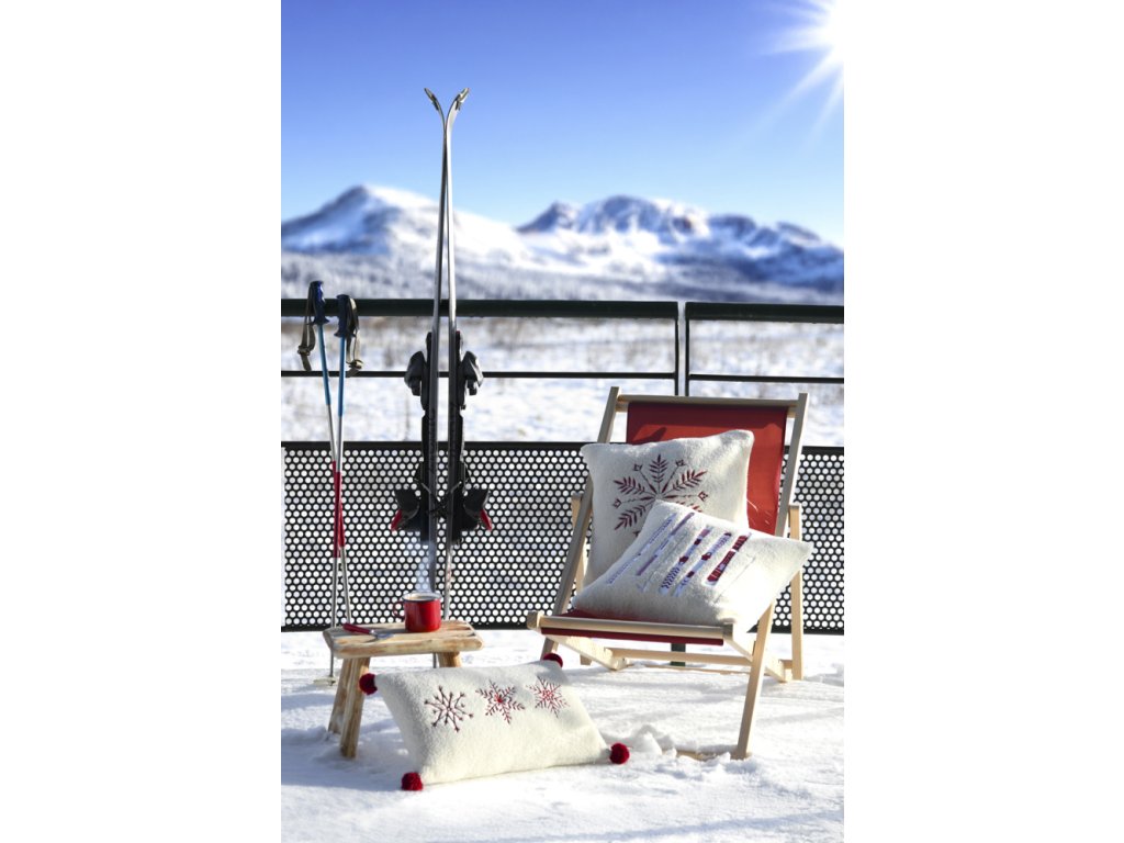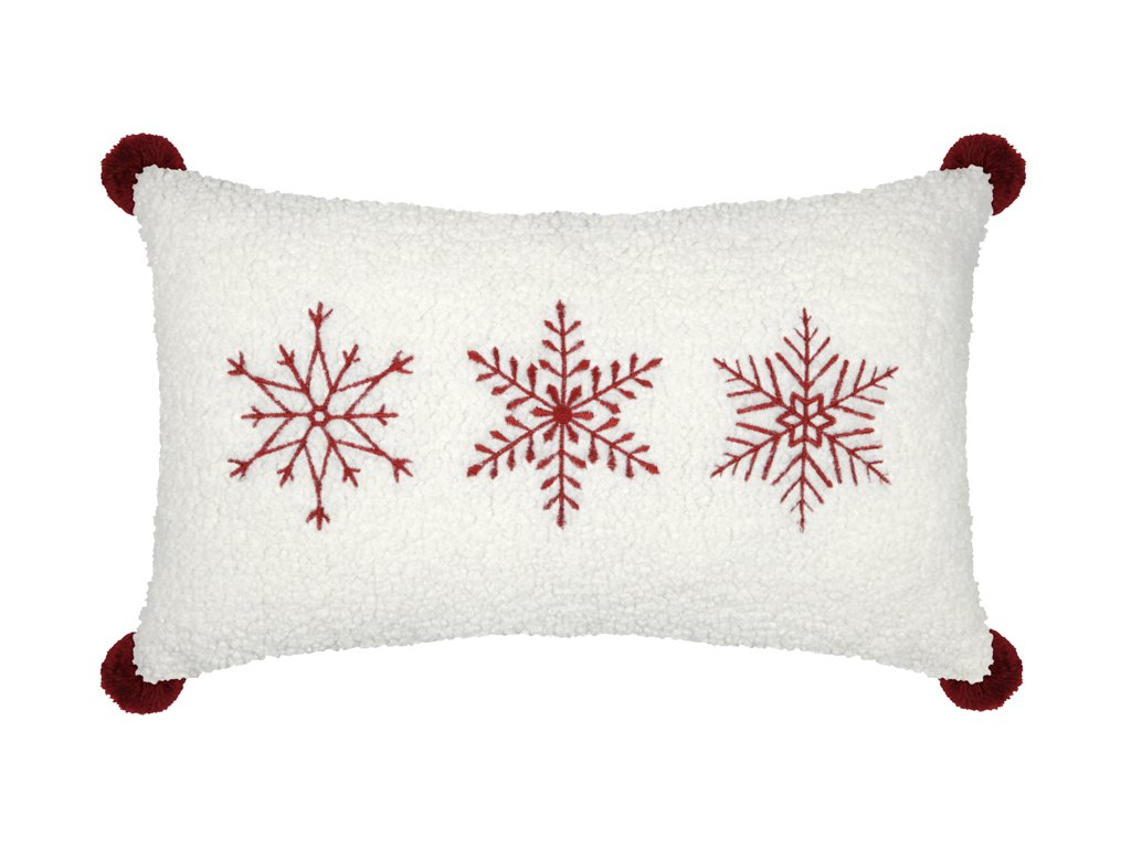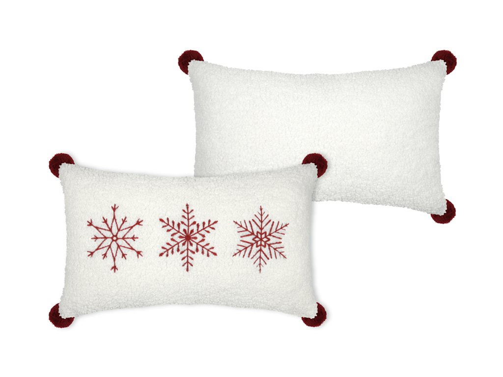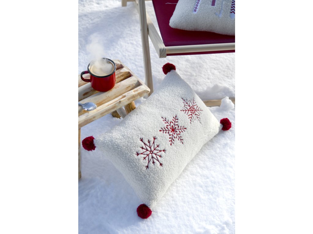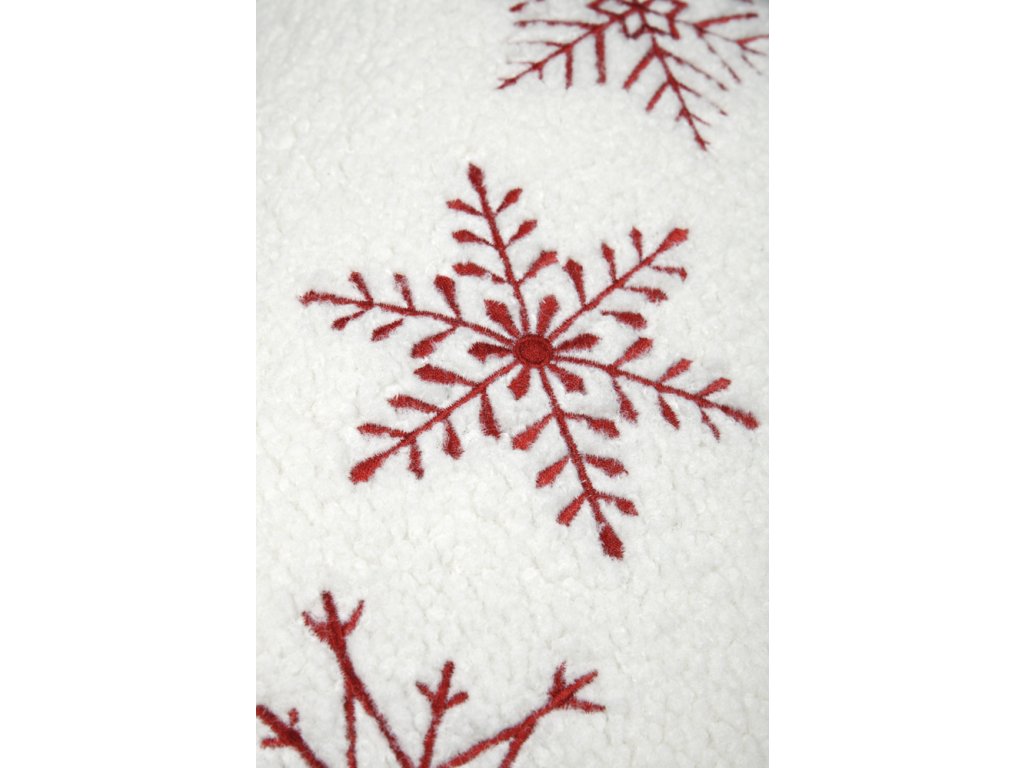 Dekoračný vankúšik v predĺženom tvare prinesie do interiéru sviatočnú a hrejivú atmosféru. Je vyrobený z extra mäkkého, huňatého materiálu v krémovo bielej farbe. Prednú stranu zdobia tri precízne vyšívané snehové vločky v sýtočervenej farbe. Vankúšik dopĺňajú tmavočervené brmbolce umiestnené v rohoch. Tento doplnok je ideálny ako akcent na sedačku alebo lavicu počas zimného a vianočného obdobia, kombinuje pohodlie s elegantným dizajnom.