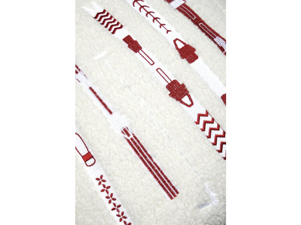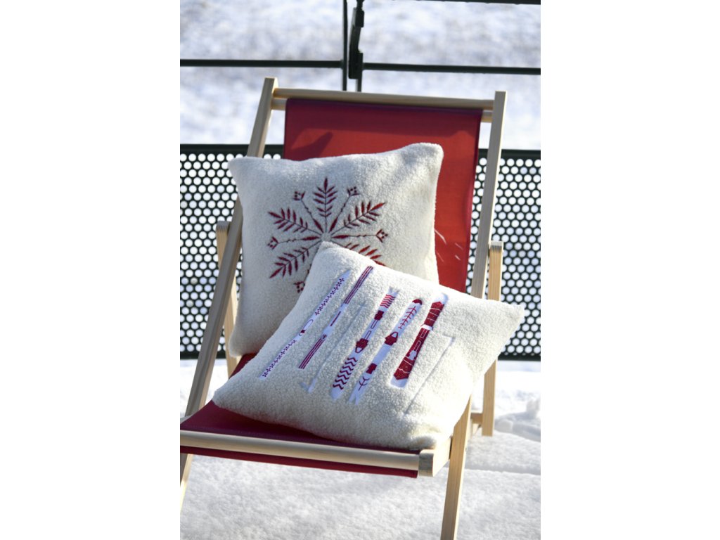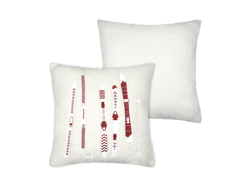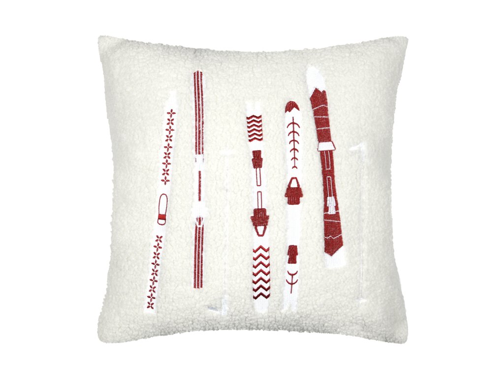 Dekoračný vankúšik v hrejivom zimnom štýle. Je vyrobený z mimoriadne mäkkého, huňatého materiálu v krémovo bielej farbe, pripomínajúceho baránka. Prednú stranu zdobí výrazná výšivka s motívmi štylizovaných lyží a palíc v červených a bielych tónoch, ktoré sú inšpirované horským folklórom. Zadná strana vankúšika je jednofarebná a zvýrazňuje plyšovú textúru. Tento doplnok je ideálny na vytvorenie útulnej, chalet atmosféry v obývačke alebo na chate.
