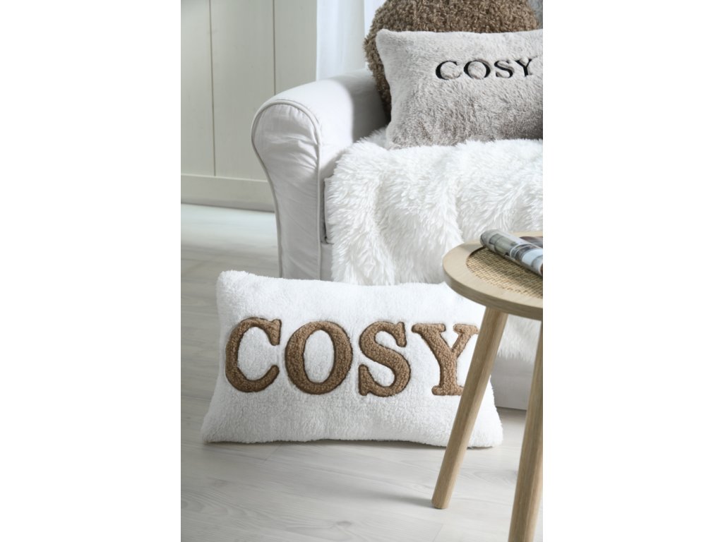 Vankúš je obojstranný a má dva rôzne vzhľady: jedna strana nesie výrazný nápis „COSY“ (útulný) v hnedej farbe, ktorý dodáva vankúšu jedinečný charakter, zatiaľ čo druhá strana je jednofarebná, čo vám umožňuje jednoducho meniť jeho vzhľad.