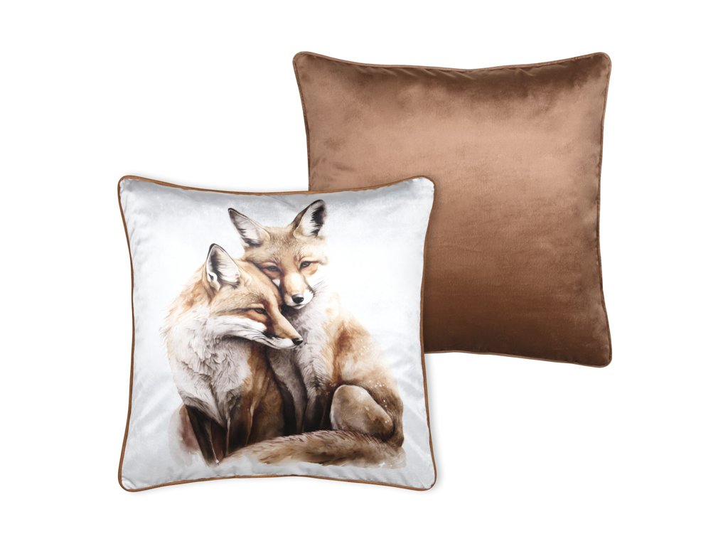 Tento elegantný dekoračný vankúš vnesie do vášho interiéru pocit prírody a štýlu. Na jednej strane je ozdobený pôsobivým motívom líšok, ktoré pôsobia ako akvarelová maľba. Druhá strana vankúša je jednofarebná, v jemnom, zamatovom hnedo-bronzovom odtieni, čo vám umožňuje jednoducho meniť vzhľad podľa nálady. Je ideálny na oživenie jednofarebnej pohovky, kresla alebo postele a skvele doplní interiéry v modernom, vidieckom alebo lesnom štýle.