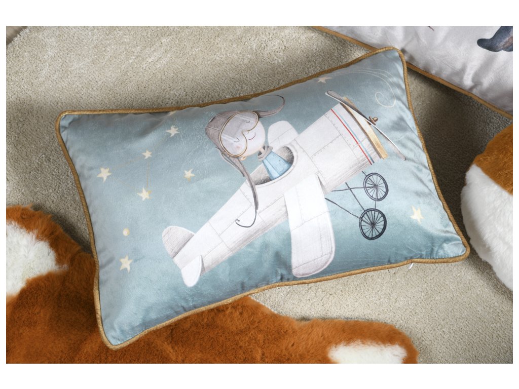 Tento roztomilý dekoračný vankúš s motívom lietadla je ideálny pre malých aj veľkých snílkov. Jeho jemný zamatový materiál a zlatý lem mu dodávajú luxusný vzhľad, zatiaľ čo modrá farba a hviezdy vytvárajú atmosféru zasnenej nočnej oblohy.
