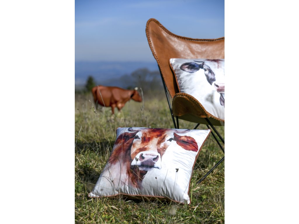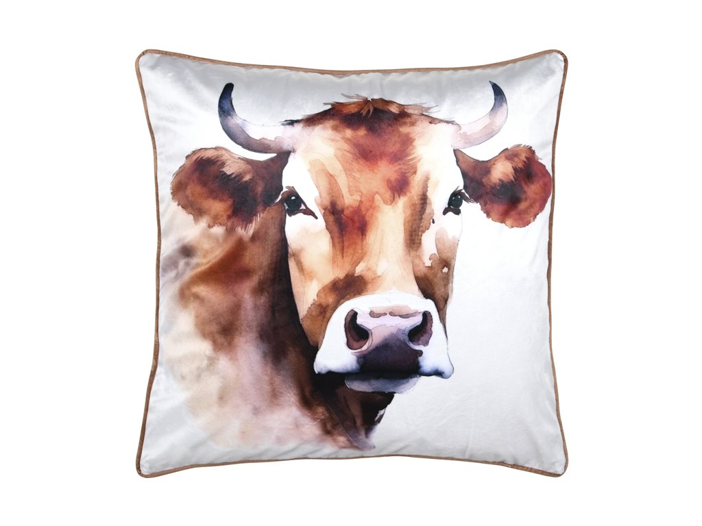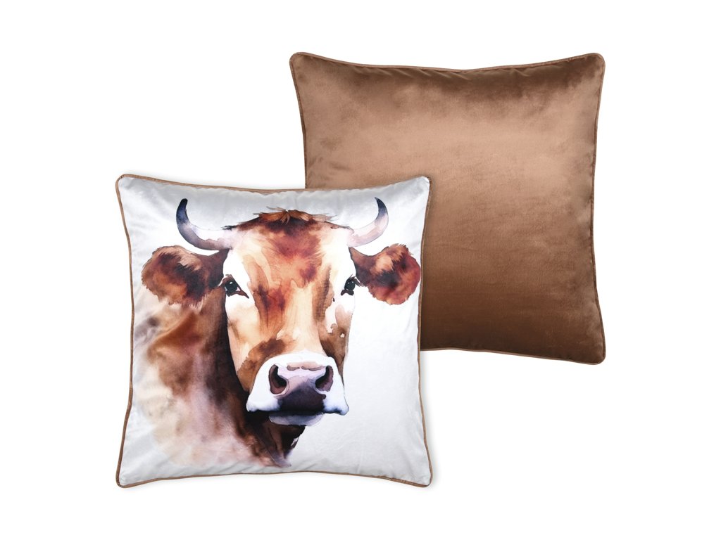 Tento originálny dekoračný vankúš vnesie do vášho interiéru moderný a zároveň rustikálny štýl. Na jednej strane je ozdobený pôsobivým motívom hlavy kravy v odtieňoch ryšavej a hnedej, ktorá pôsobí ako akvarelová maľba. Druhá strana vankúša je jednofarebná, v jemnom, zamatovom hnedo-bronzovom odtieni, čo vám umožňuje jednoducho meniť vzhľad podľa nálady. Je ideálny na oživenie jednofarebnej pohovky alebo kresla a skvele doplní interiéry v modernom, vidieckom alebo farmárskom štýle.