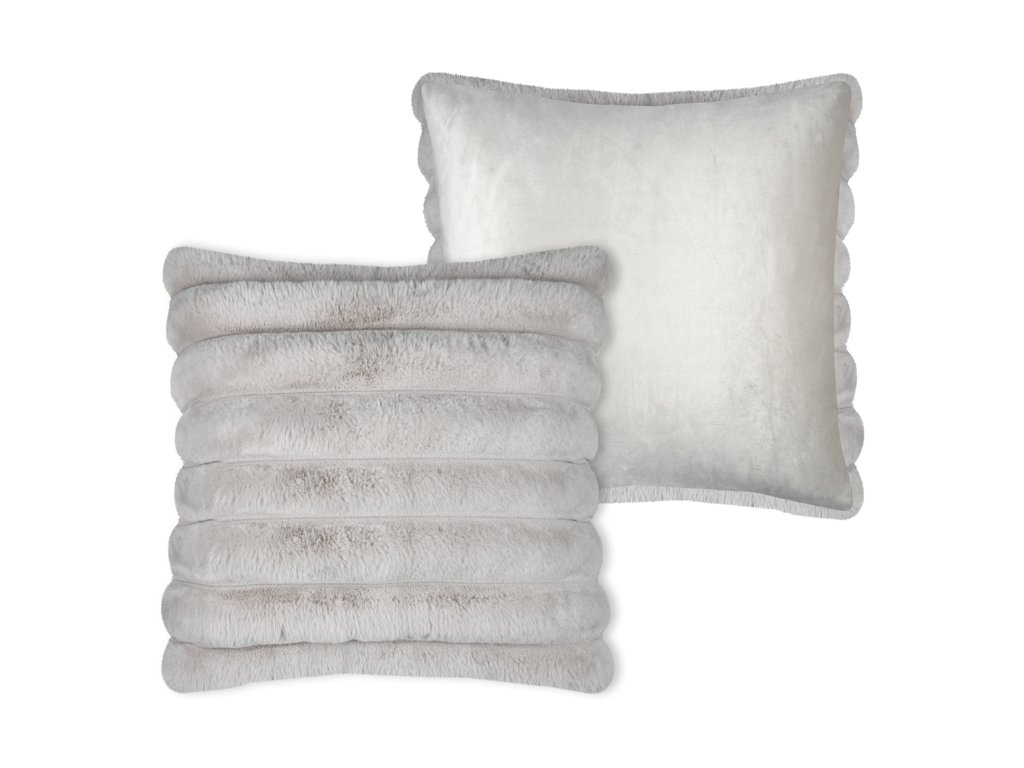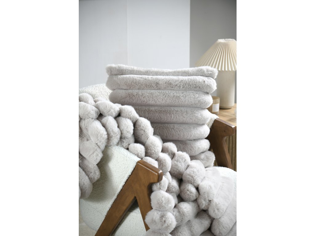 Jedna strana, v jemnej béžovej farbe, má vrúbkovanú štruktúru imitujúcu kožušinu, ktorá dodá textúru a hĺbku vašej pohovke alebo posteli. Na dotyk je nesmierne mäkká a príjemná, vďaka čomu je ideálna na relax. Druhá strana je hladká, s elegantným volánikovým lemom, ktorý dodáva vankúšu hravý a sofistikovaný vzhľad.