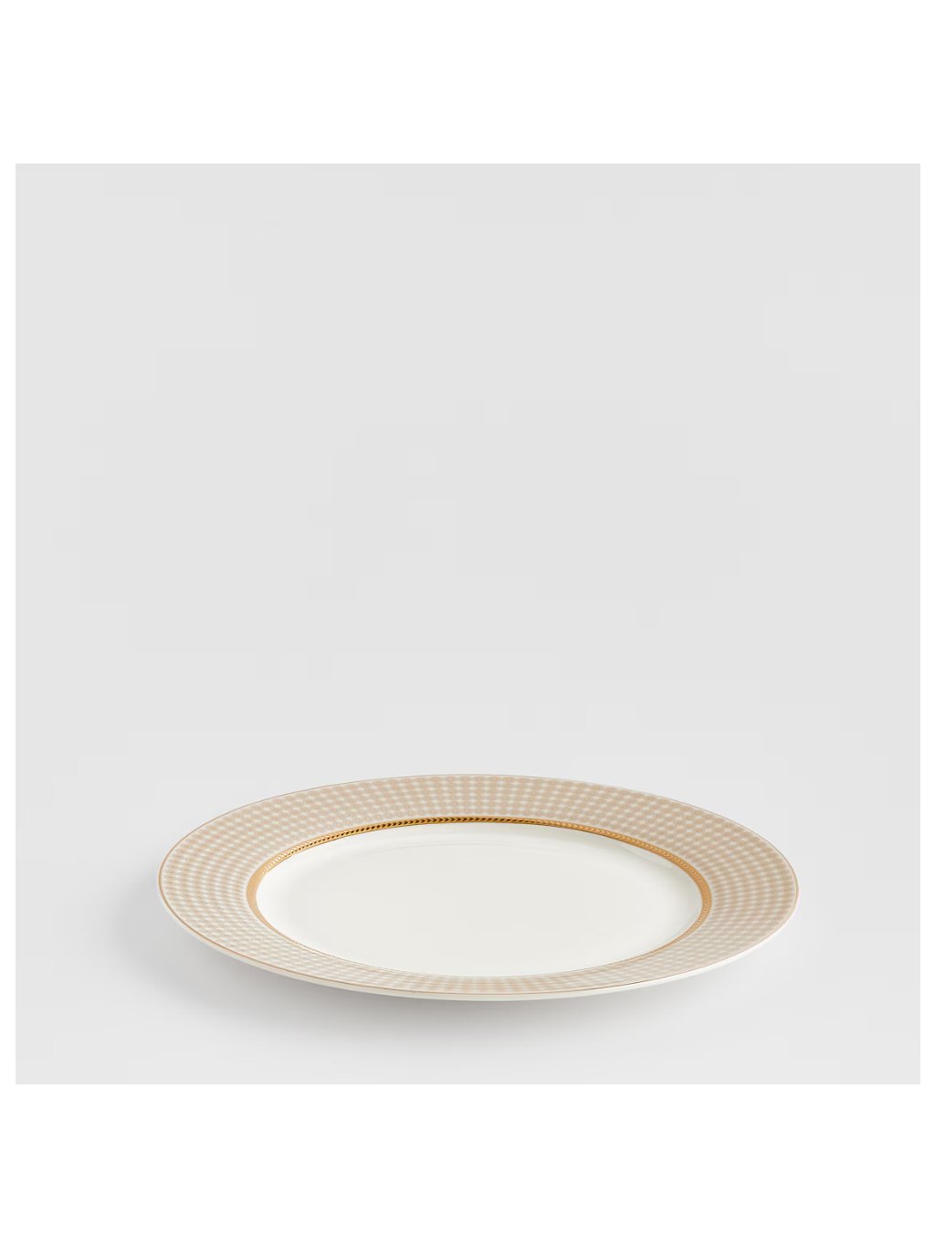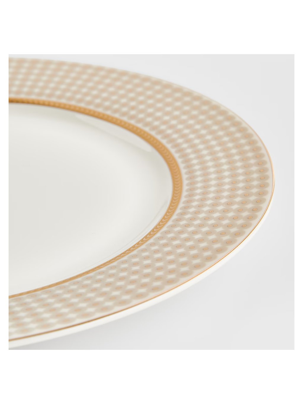 Štýlová kompozícia: Béžový odtieň taniera v spojení s geometrickým motívom a pozláteným vykońčením vytvára šik kompozíciu ideálnu pre elegantné aj moderné prestieranie.
