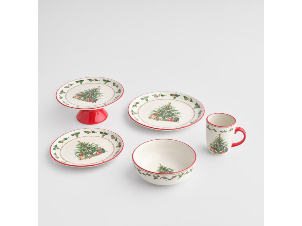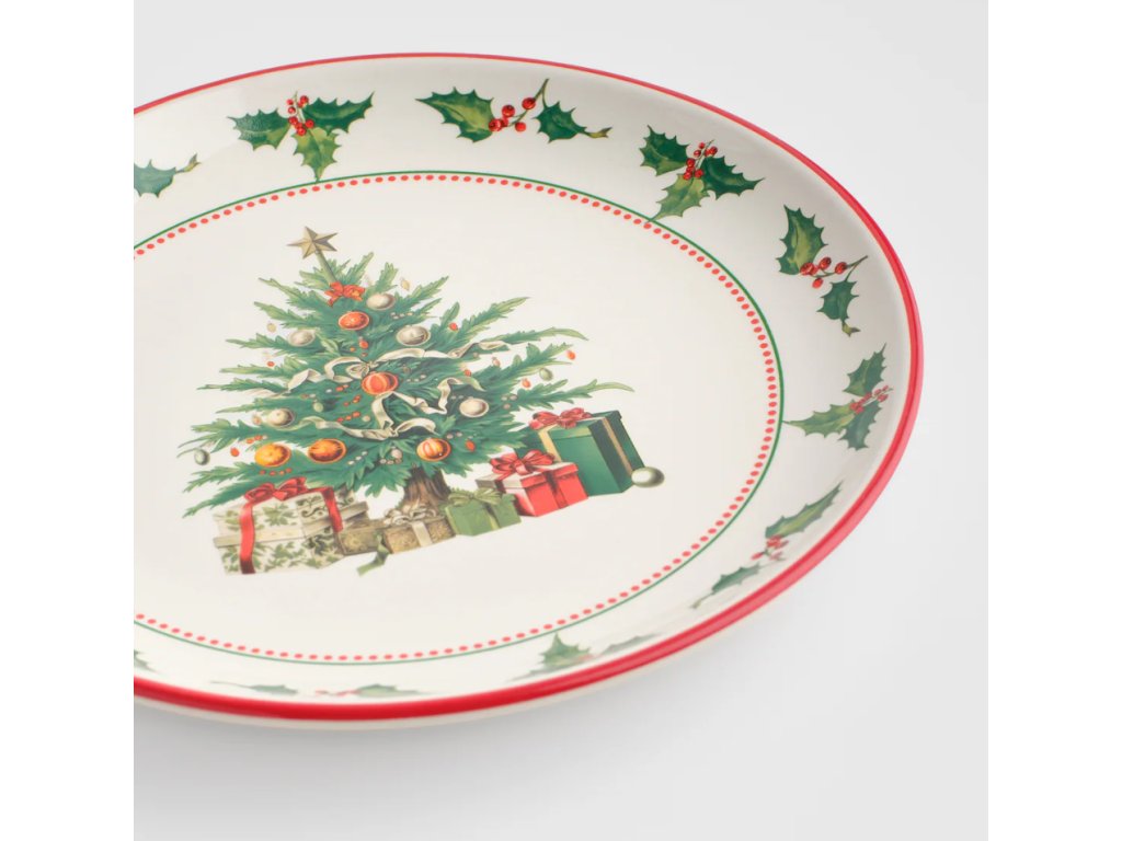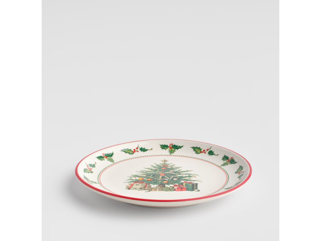 Podávajte vianočné koláče, dezerty a iné sviatočné dobroty s týmto pôvabným dezertným tanierom Regalos. Tanier s priemerom 21 cm je vyrobený z dolomitu/keramiky v krémovom odtieni, čo zaručuje jeho odolnosť a tradičný šarm. Centrum taniera zdobí nádherná, detailná potlač bohato ozdobeného vianočného stromčeka s darčekmi, ktorá okamžite navodí sviatočnú atmosféru. Okraj taniera je lemovaný decentným červeným okrajom a po obvode sa tiahne klasický vianočný vzor s listami a bobuľami cezmíny v červeno-zelených tónoch. Je to ideálny kúsok pre sviatočné stolovanie a skvele sa kombinuje s ostatným riadom z vianočnej kolekcie.