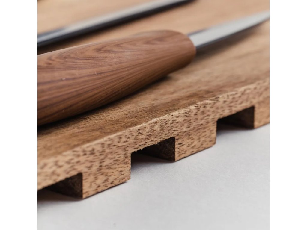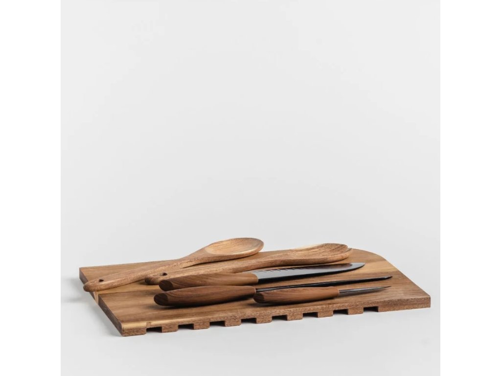 Súprava nožov a šalátových lyžíc TRINOLE prináša do vašej kuchyne dokonalú kombináciu funkčnosti a prírodnej elegancie. Táto súprava obsahuje dve štýlové šalátové lyžice a tri esenciálne nože – nôž na chlieb, univerzálny nôž a nôž Santoku, všetko precízne uložené na elegantnej krájacej doske. Nástroje sú vyrobené z kvalitných materiálov s drevenými rukoväťami a tmavými čepeľami/funkčnými časťami, čo im dodáva moderný, no zároveň teplý vzhľad. Ideálna pre každodenné varenie aj servírovanie.