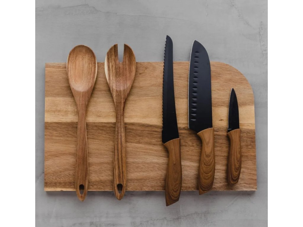 Sada (balenie): 2 šalátové lyžice, 3 nože, nože na chlieb a nôž Santoku, krájacia doska