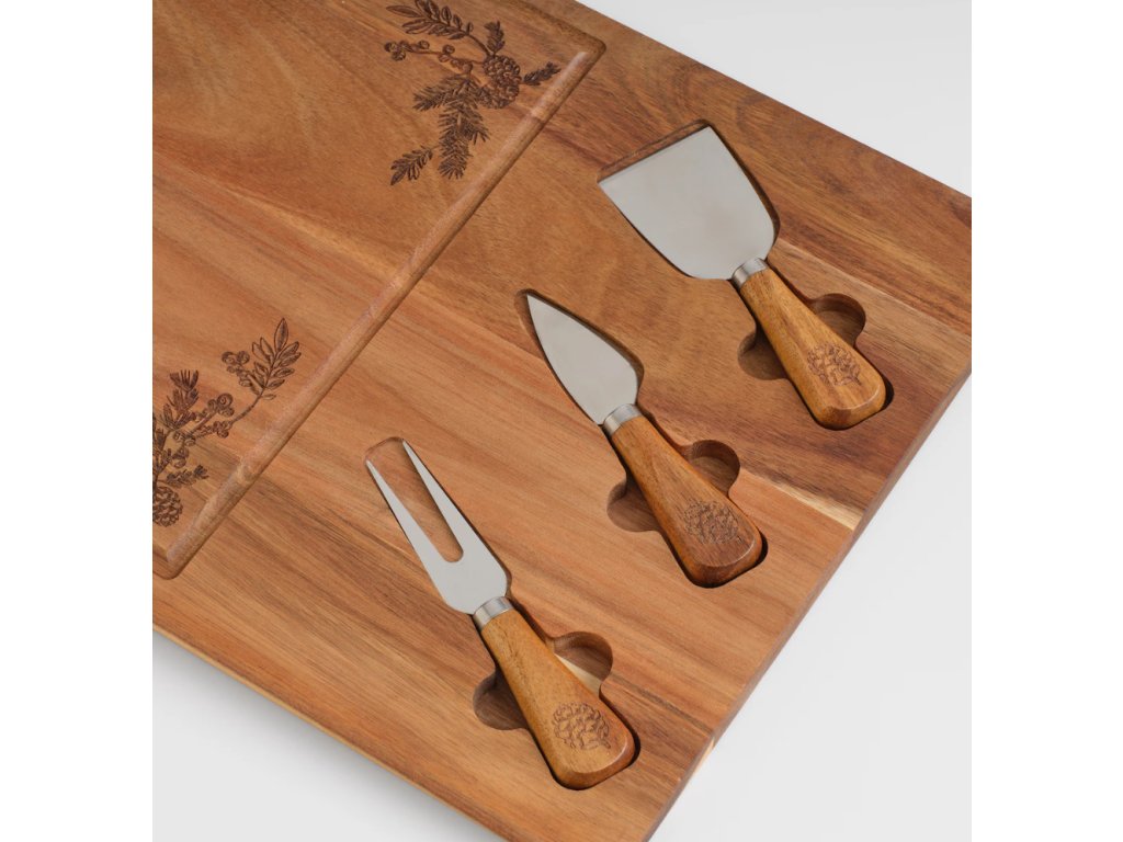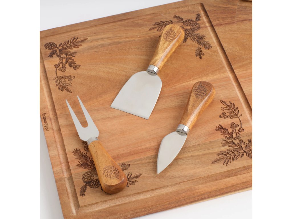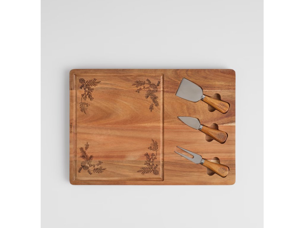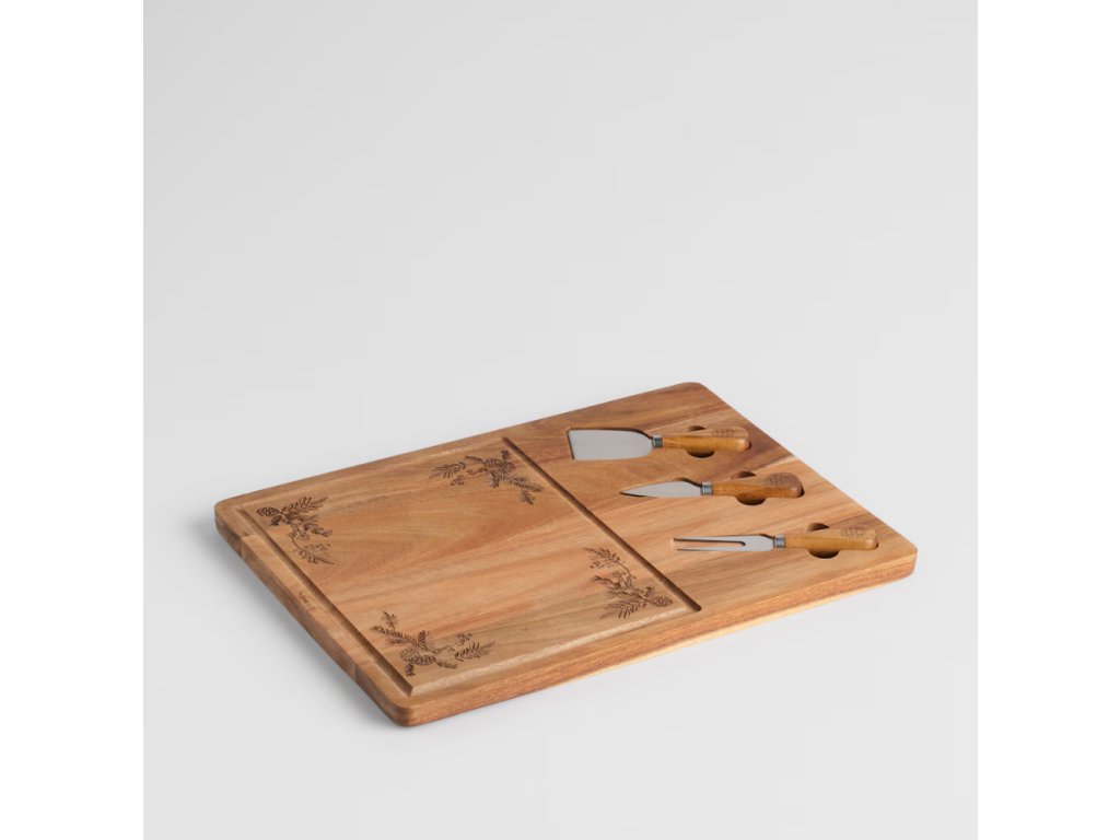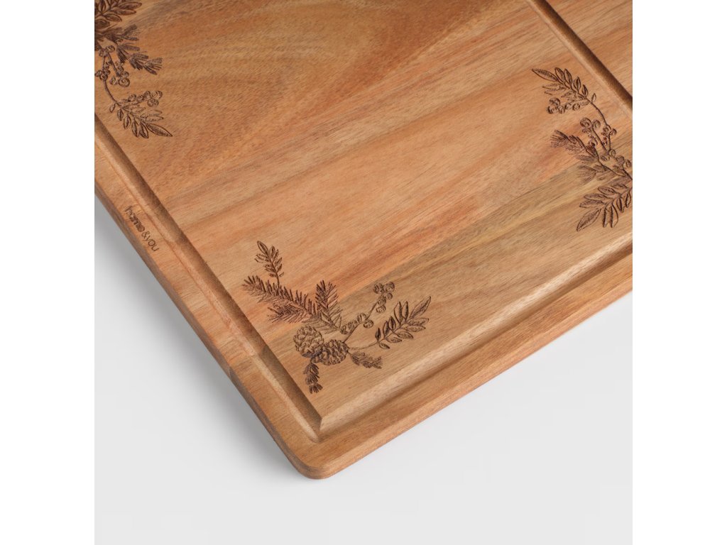 Táto servírovacia doska z teplého akáciového dreva je ideálna na sviatočné pohostenie. Má vyrytý (razený) motív ihličia/vetvičiek a je vybavená praktickým vybráním pre malé servírovacie nástroje.