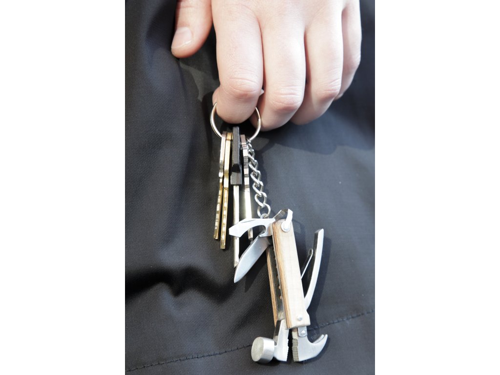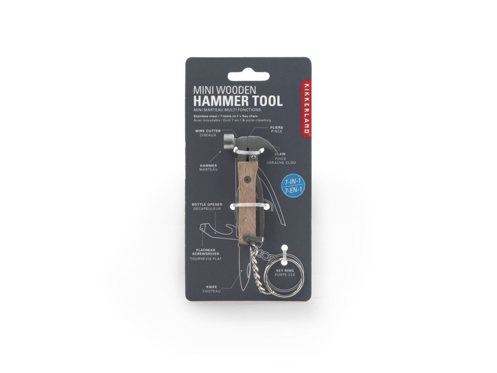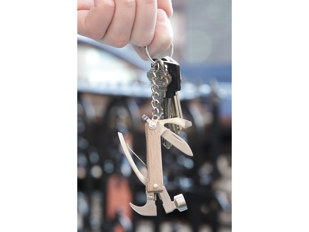 Toto malé kladivo má v sebe veľkú silu. Každé kladivo obsahuje plochý skrutkovač, otvárač na fľaše, nôž, kliešte, rezačku drôtov a kliešte na drôty. Vďaka praktickému krúžku na kľúče ho môžete ľahko nosiť so sebou. Kladivo má hnedú farbu.