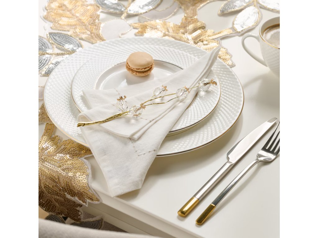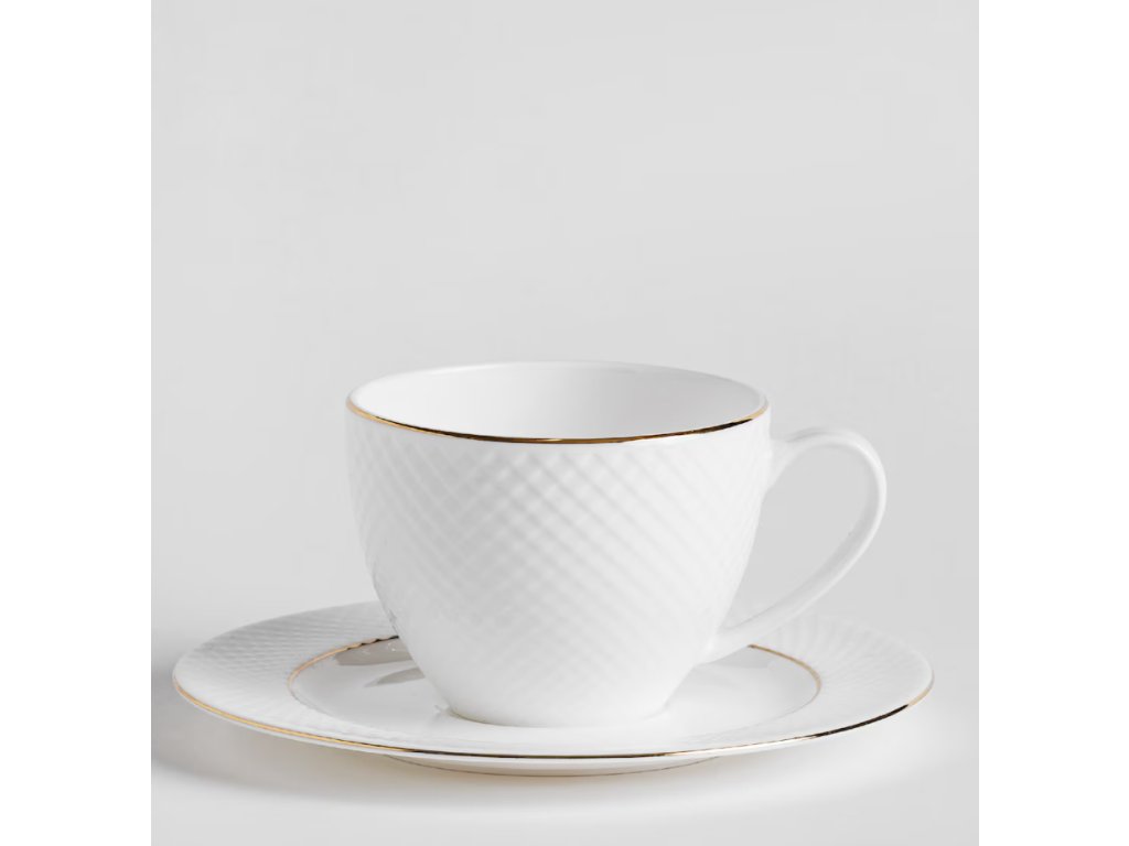 Šálka s podšálkou Eleni je elegantný prvok, ktorý dodá šarm a triedu vášmu stolovaniu. Súprava je ideálna na podávanie aromatickej kávy alebo čaju. Je vyrobená z vysokokvalitného kostného porcelánu a je nielen estetická, ale aj trvácna a ľahko sa čistí. Jej jemná textúra a lesklá zlatá obruba dodávajú eleganciu a triedu, a zároveň sa hodia k rôznym aranžmánom stola. Klasická biela farba spôsobuje, že sa šálka hodí ku každému servisu a každému prestieraniu, dodávajúc mu výnimočný charakter. Dokonale sa hodí k moderným, ako aj tradičným aranžmánom, dodávajúc im subtílnosť a šarm. Podšálka plní funkciu nielen praktickú, ale aj dekoračnú, tvoriac elegantnú podstavu pre šálku. Spolu tvoria harmonický duet, ktorý uchváti svojou jednoduchosťou a klasickým pôvabom.