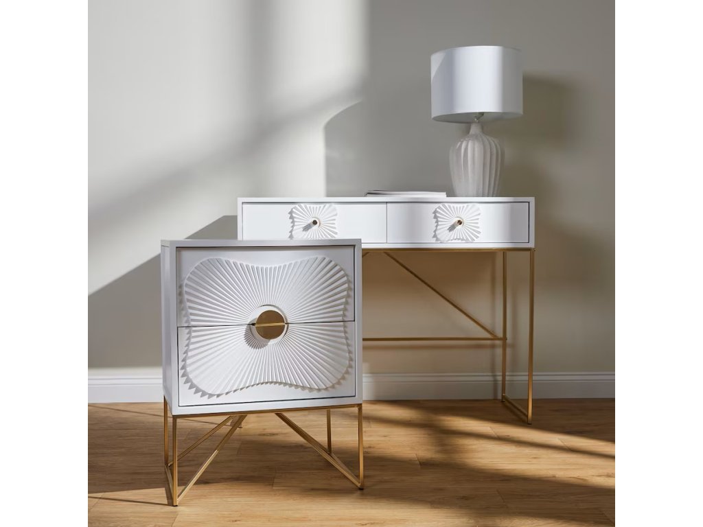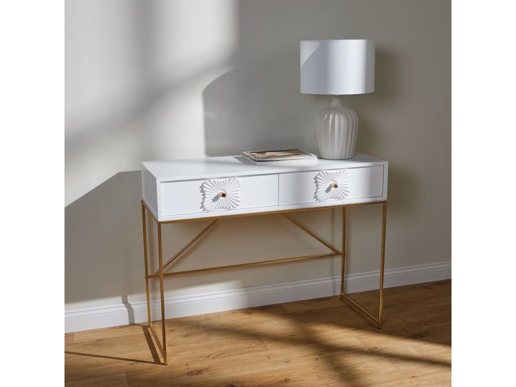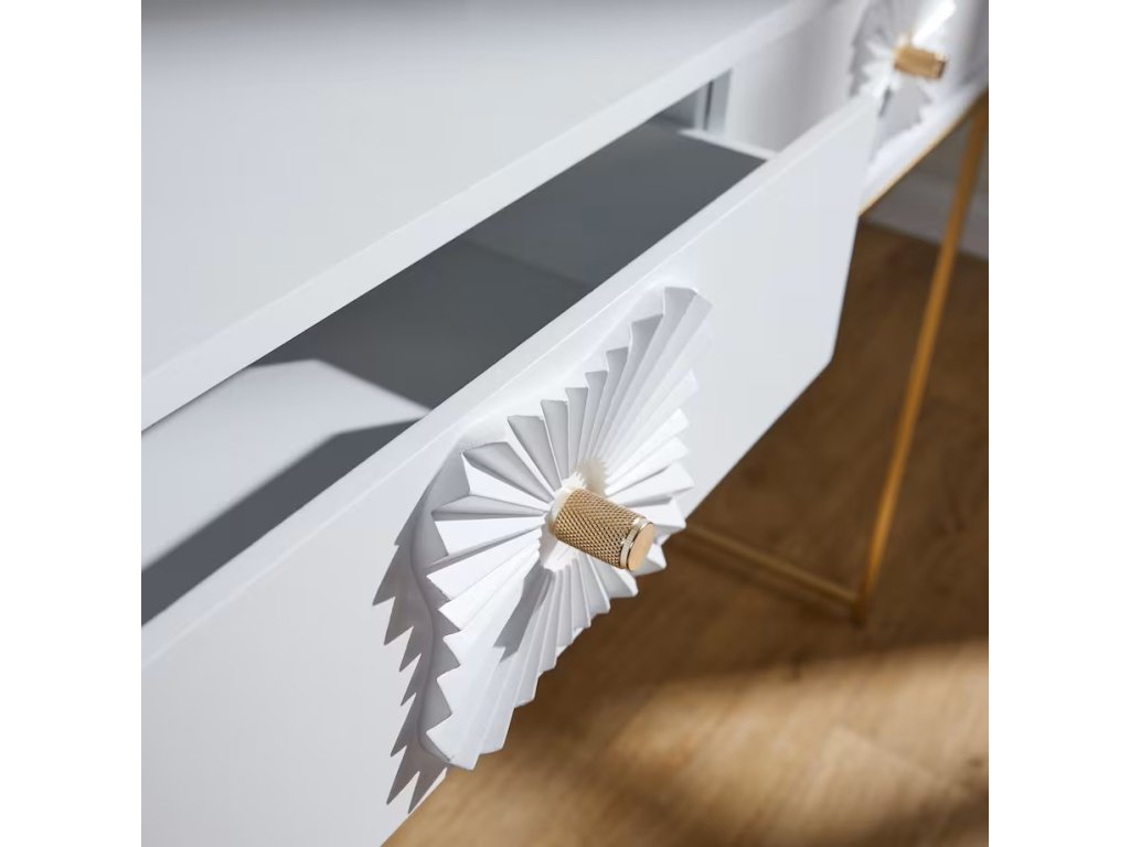 Elegantný konzolový stôl vyrobený z MDF a kovu v bielej farbe. Jeho minimalistický dizajn a kombinácia moderných materiálov ho robia ideálnym do rôznych interiérových riešení. Je ideálny do chodby, obývačky alebo kancelárie, má praktickú a dekoratívnu funkciu a zároveň prináša priestrannosť a štýl.