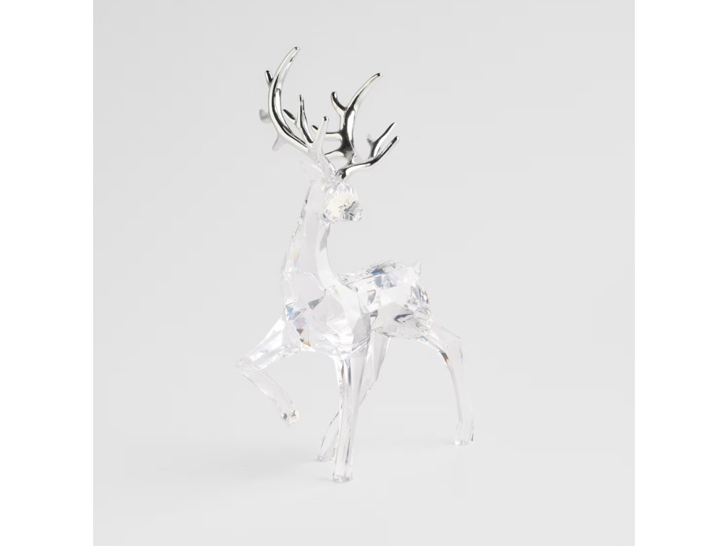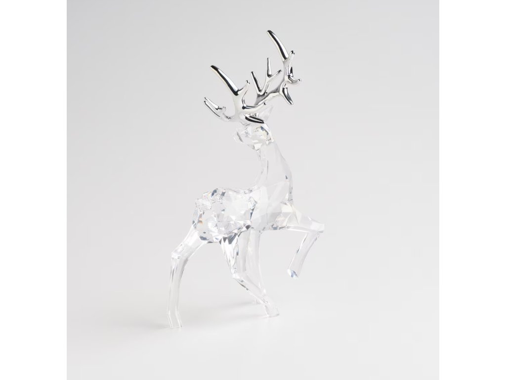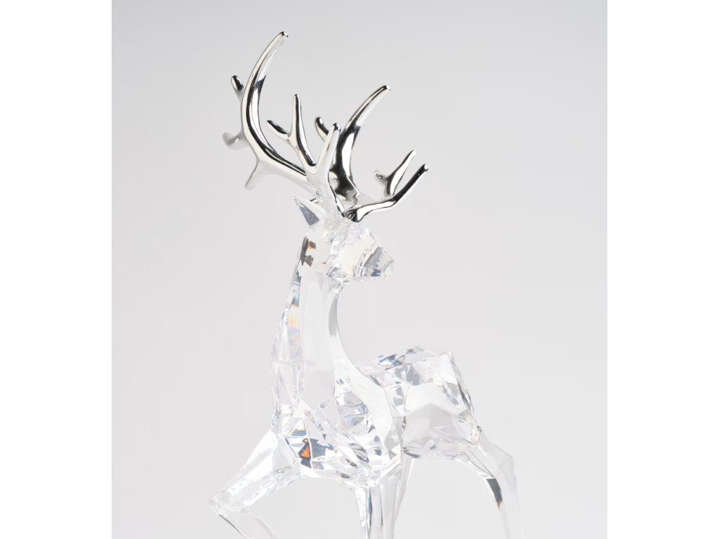Vytvorte si vo svojom domove oslnivú zimnú atmosféru s touto elegantnou figúrkou soba, ktorá pôsobí ako ľadová socha. Táto vysoká dekorácia, dosahujúca 31cm, je vyrobená z priehľadného akrylu a má fazetovaný povrch, ktorý verne imituje brusenie krištáľu. Vďaka tomuto spracovaniu figúrka magicky láme svetlo a trblieta sa ako čerstvo napadaný sneh. Parohy soba sú galvanizované, s lesklou striebornou (alebo chrómovou) úpravou, ktorá dodáva celku moderný a elegantný štýl. Figúrka je dokonalým doplnkom na krbovú rímsu, konzolový stolík alebo do vitríny, kde vnesie do priestoru nádych luxusu a mrazivej severskej krásy.