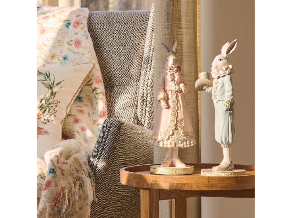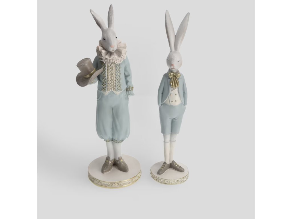 Veľkonočná figúrka vyrobená zo živice v jemnej svetlomodrej farbe s výškou 31 cm. Štýlové a precízne spracovanie z nej robí výnimočný dekoratívny prvok, ktorý do interiéru vnesie sviežosť a jarnú náladu. Je ideálna na ozdobu stola, komody alebo do sviatočných aranžmánov.