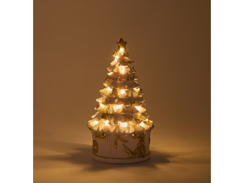 Biela vianočná figúrka v tvare stromčeka je elegantným dekoratívnym akcentom. Vďaka zlatým detailom, malým guľôčkam a retiazkam dodáva vianočnému aranžmánu luxusný a sofistikovaný ráz. Táto figúrka sa skvele hodí na komodu, poličku alebo krbovú rímsu a okamžite vytvorí vo vašom domove magickú sviatočnú atmosféru.