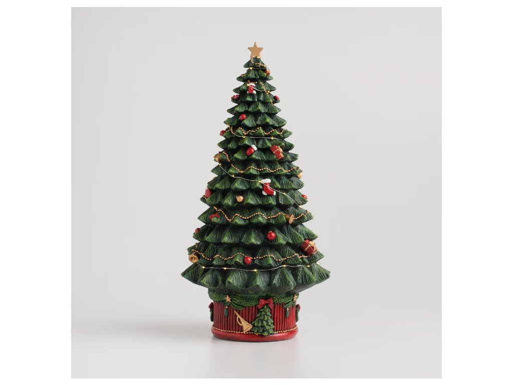 Táto očarujúca LED figúrka v tvare vianočného stromčeka je ideálnym doplnkom, ktorý rozžiari váš domov počas sviatočného obdobia. Vyrobená zo zelenej živicovej hmoty, s detailnými ozdobami ako sú červené gule, zlaté retiazky a malé darčeky, vytvára tradičnú a radostnú atmosféru. S výškou 50 cm a s priemerom 25 cm je ideálna na komodu, stôl alebo ako súčasť vianočnej výzdoby, napájaná dvoma batériami AA.